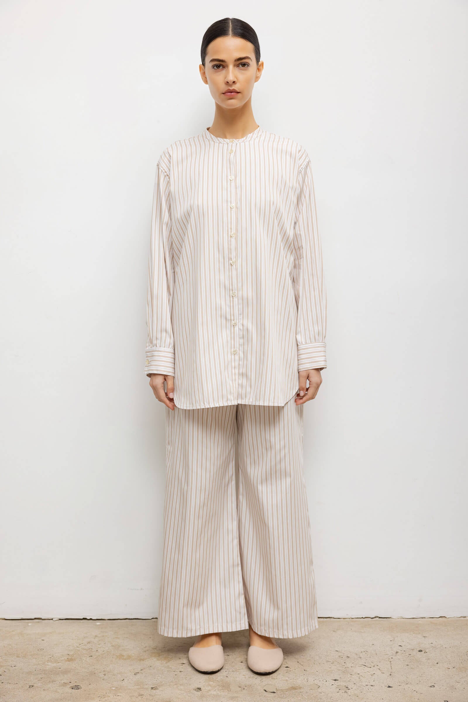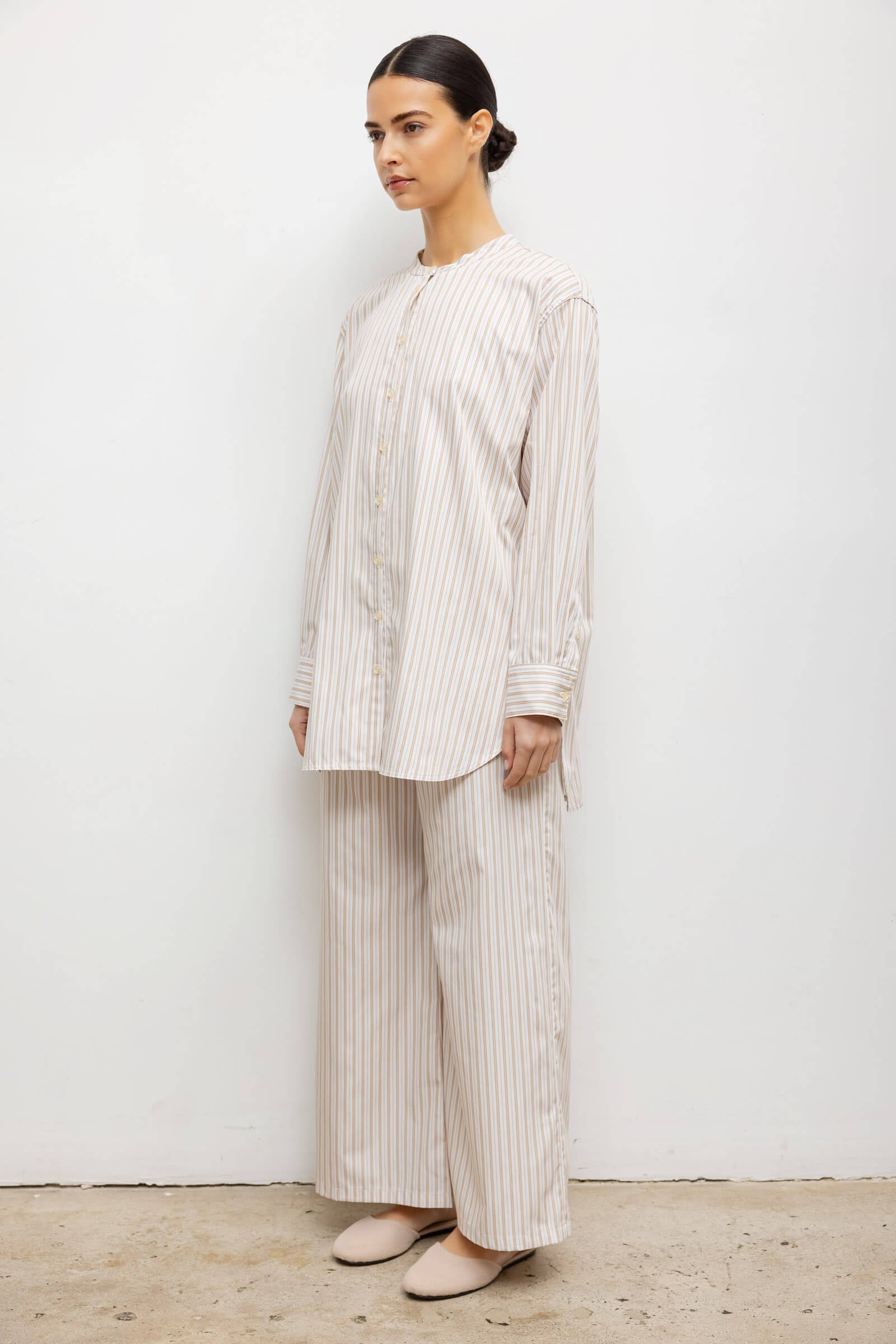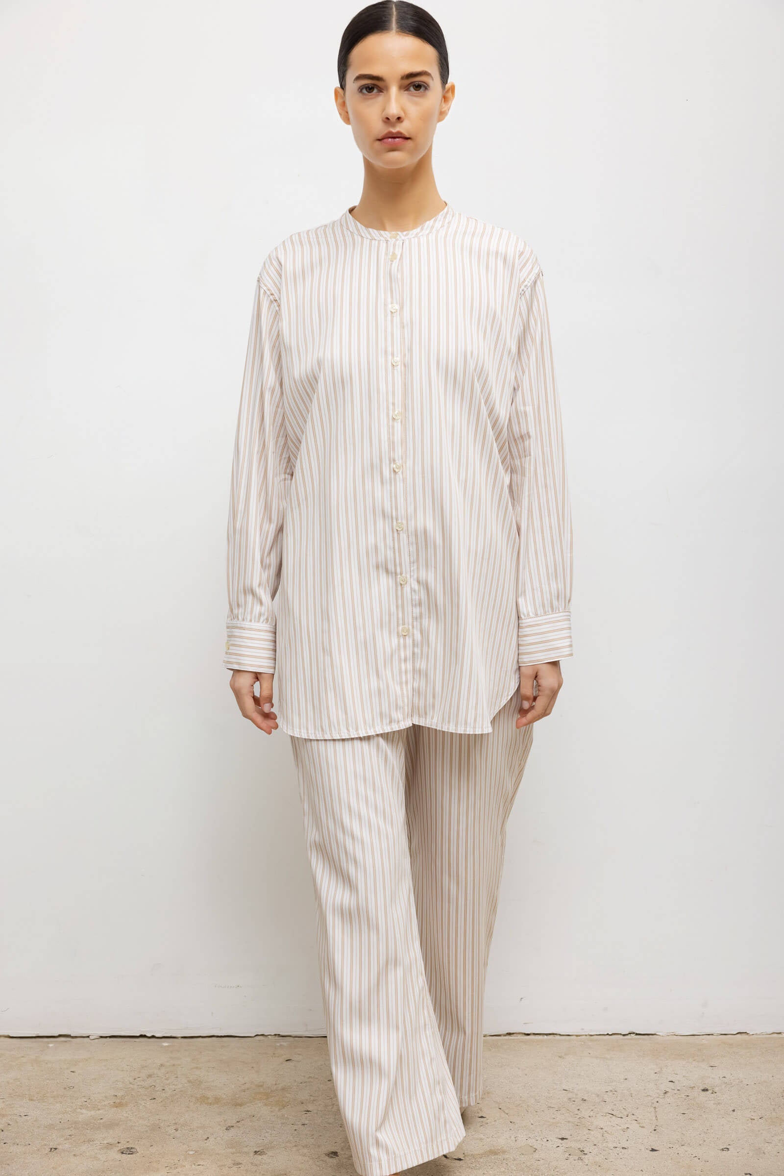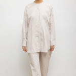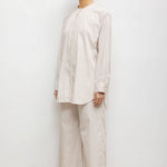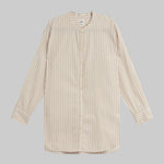 Cut in our striped Yoshi Cotton Twill, The Yoshi Collarless Button Down features a classic grandad collar, full length sleeves, and a slightly elongated length. From desk to dusk — we’re wearing this to the office during the week then as a chic cover-up to the beach.