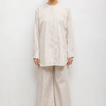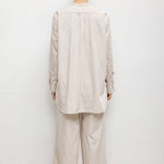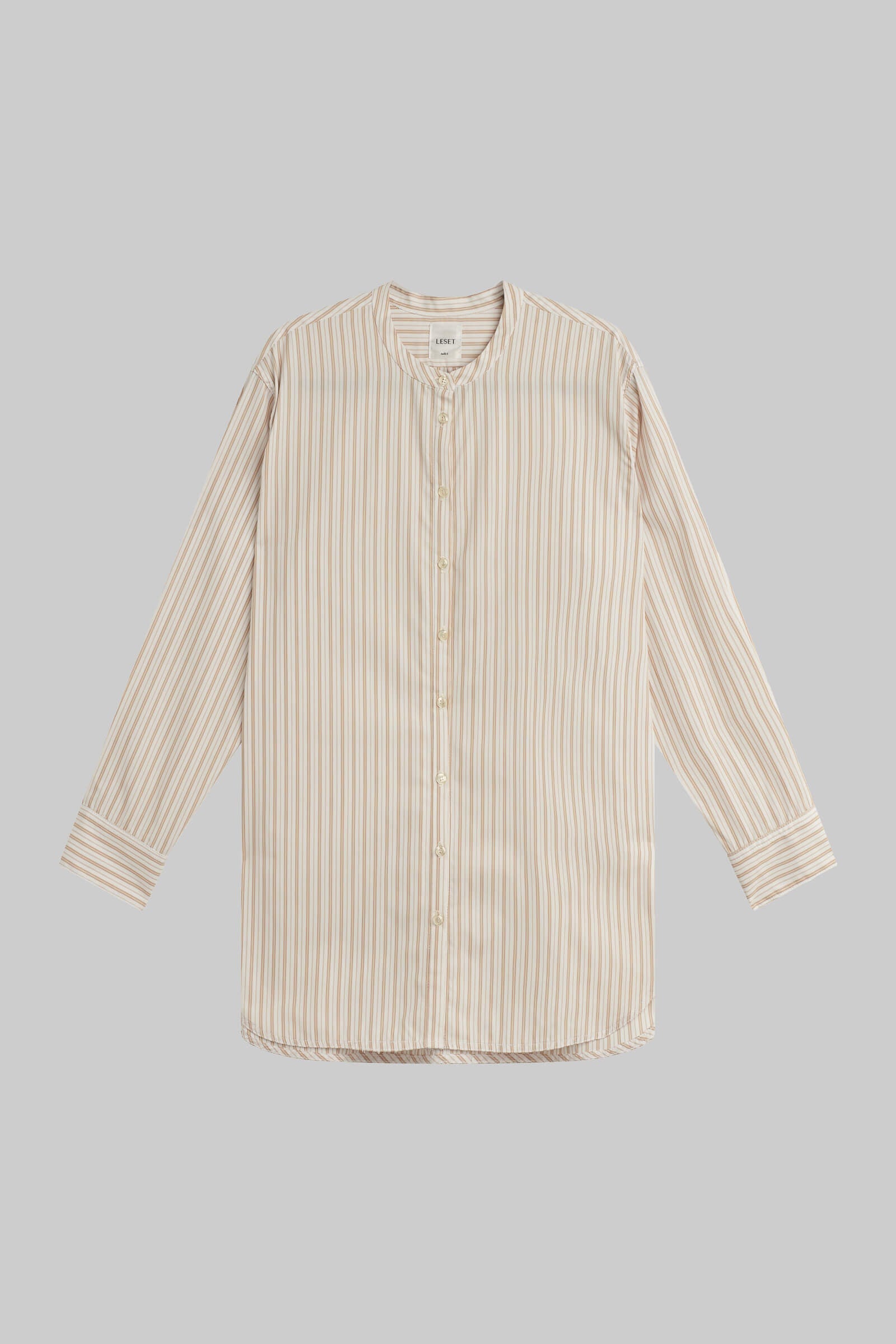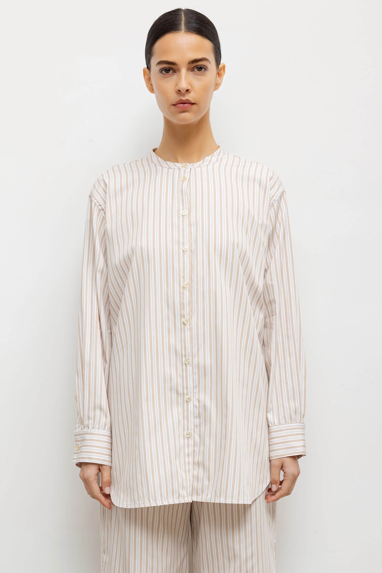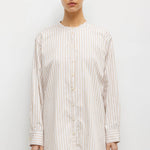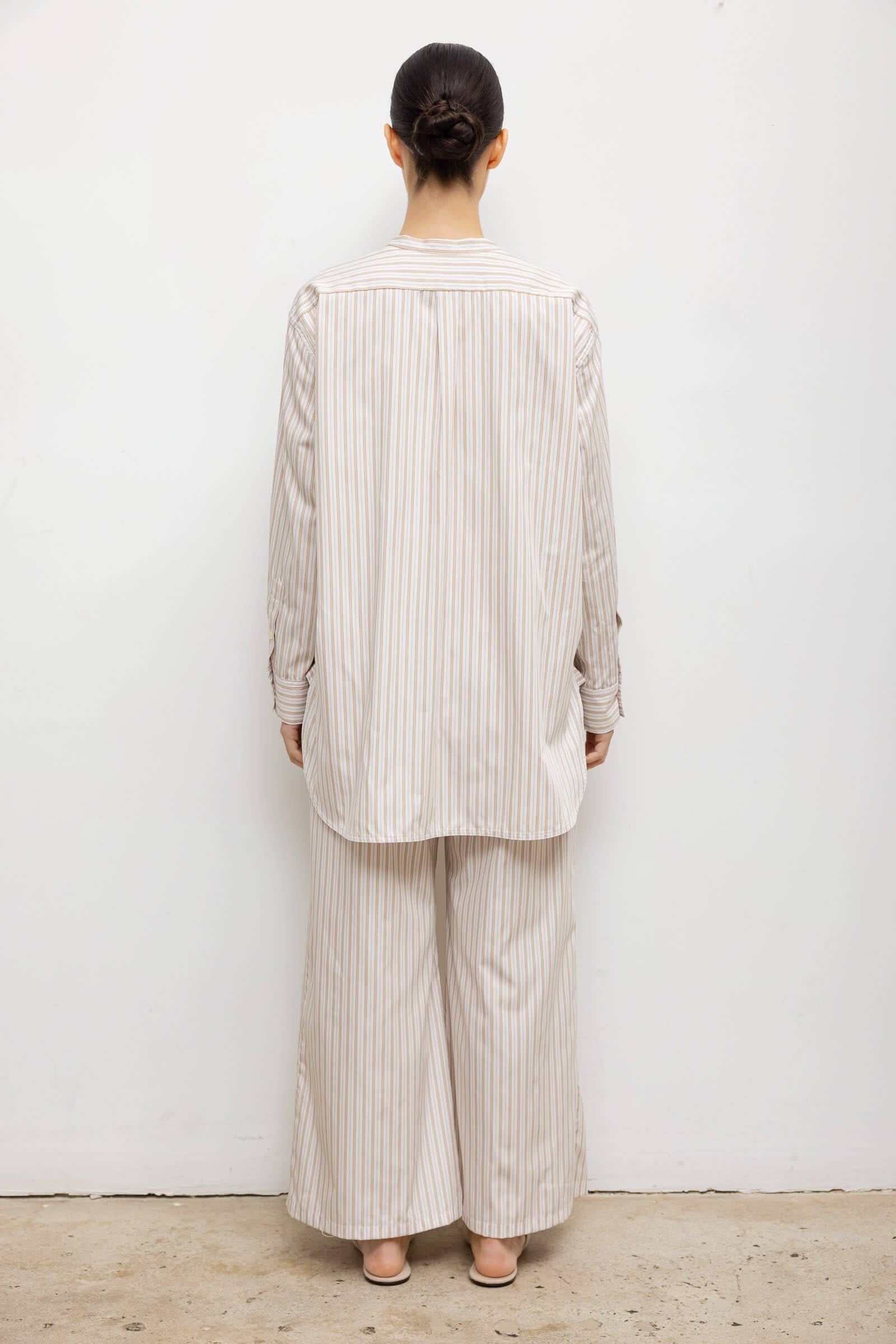 Cut in our striped Yoshi Cotton Twill, The Yoshi Collarless Button Down features a classic grandad collar, full length sleeves, and a slightly elongated length. From desk to dusk — we’re wearing this to the office during the week then as a chic cover-up to the beach.