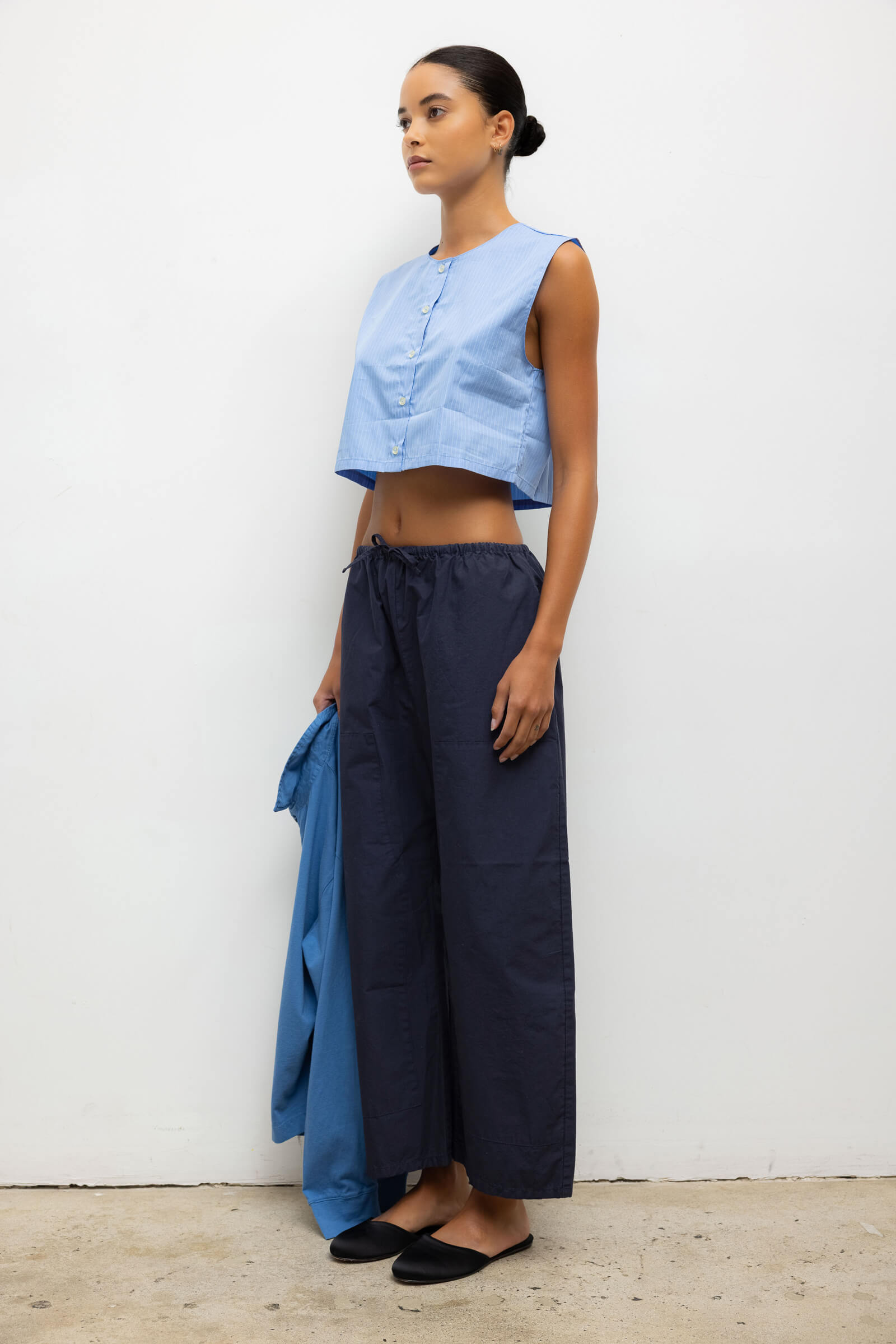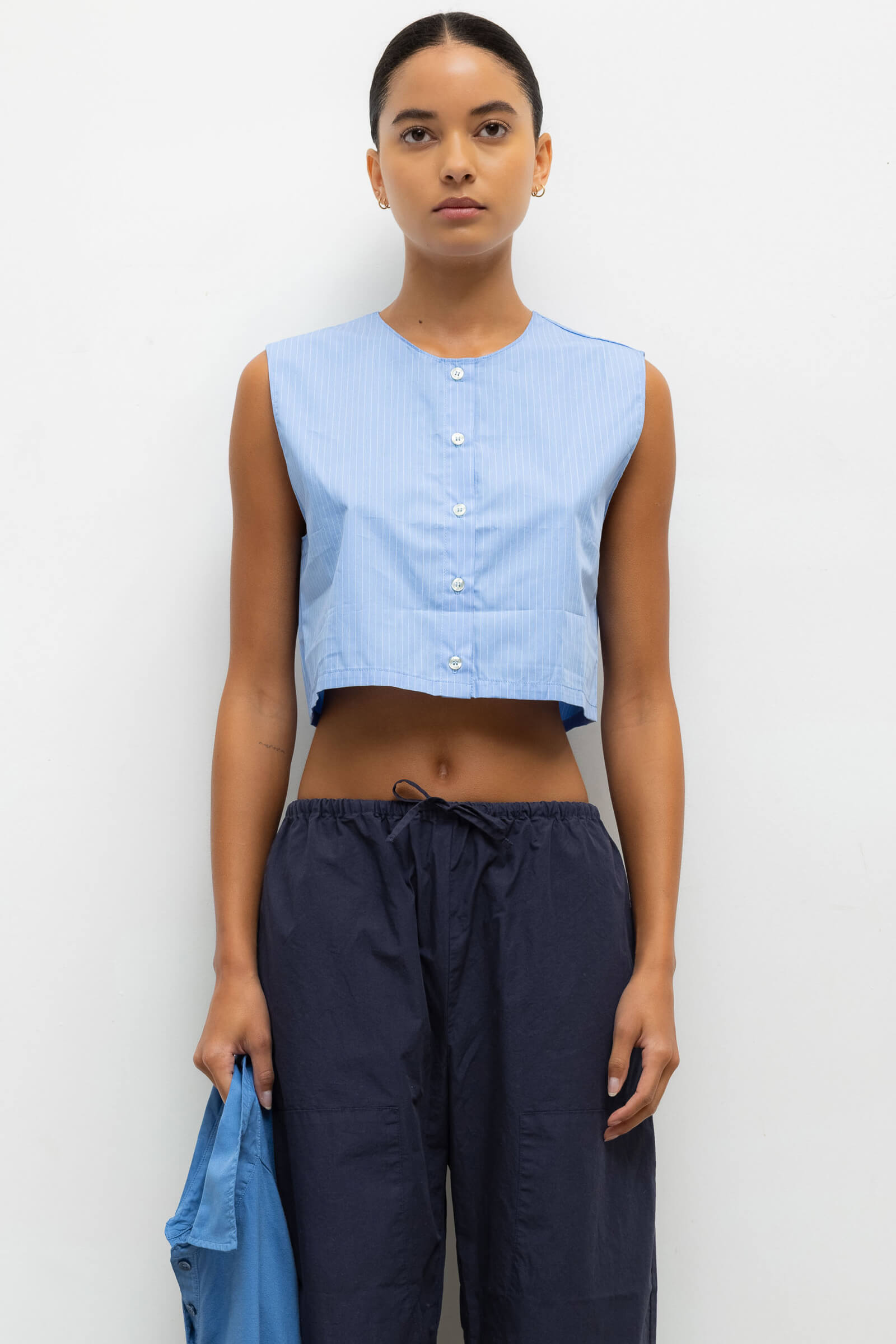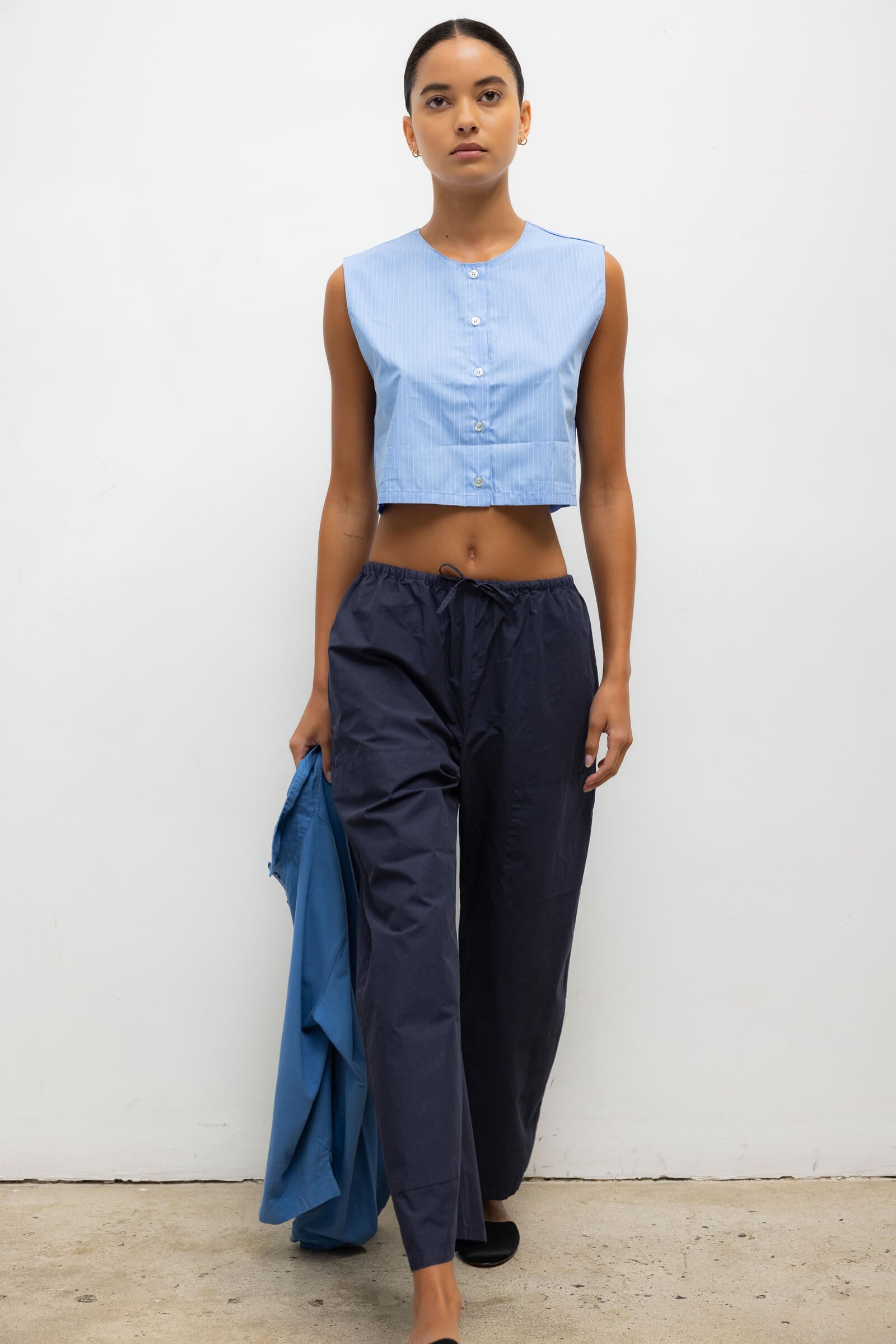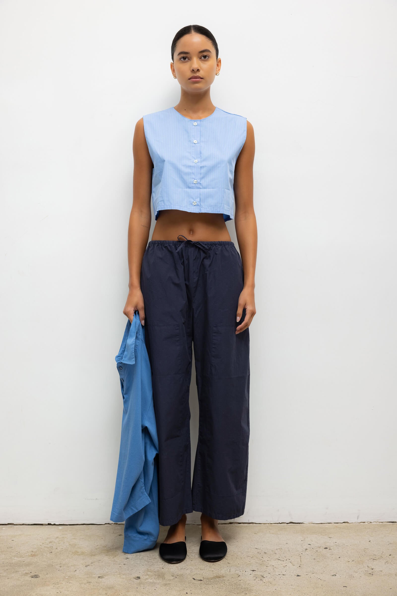 Cut in our striped Yoshi Cotton Twill, The Yoshi Crewneck Vest is a sleeveless silhouette, featuring a crew neckline, exposed button placket, and a cropped length. Make it a matching set with the Yoshi Drawstring Pant.