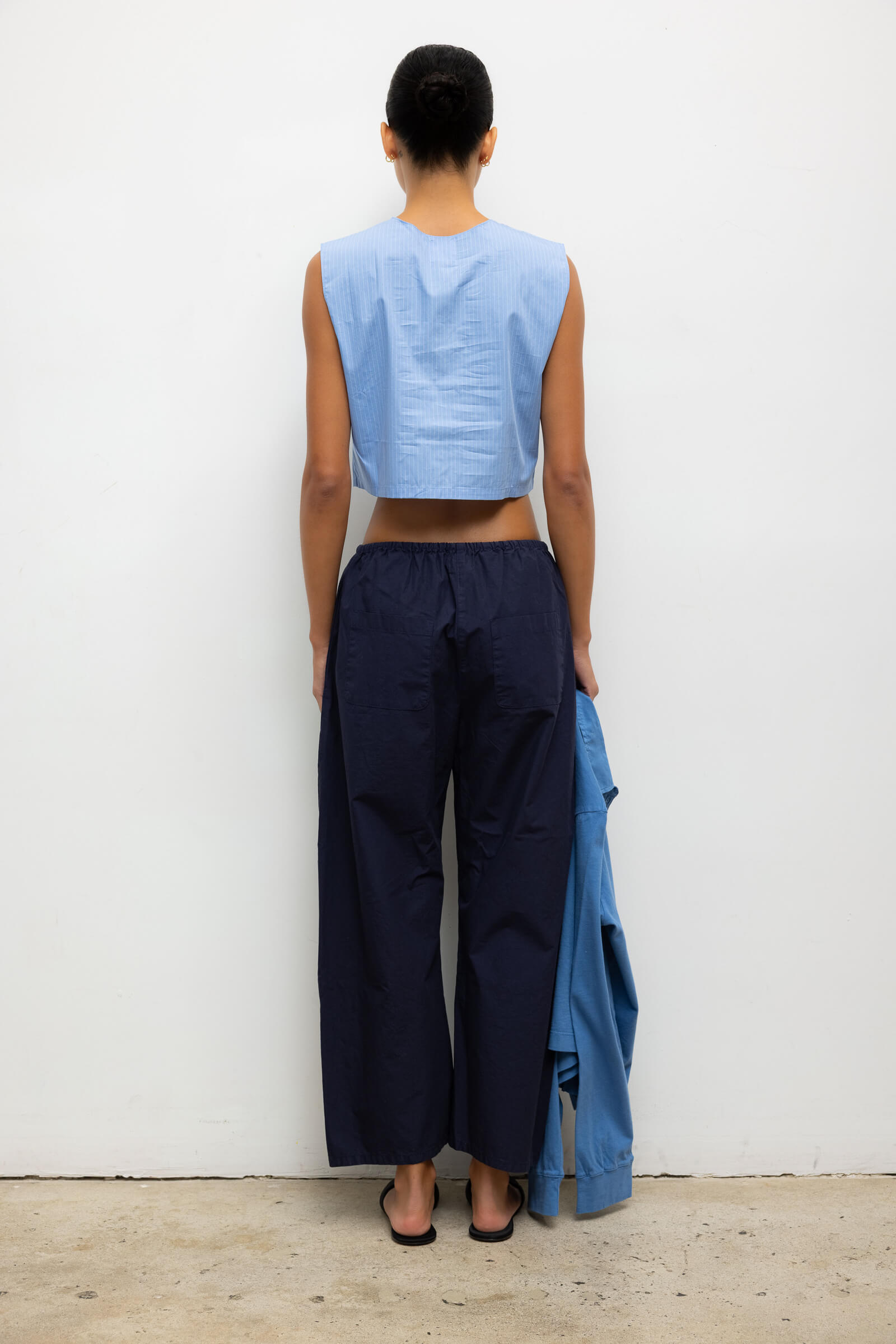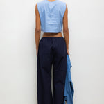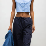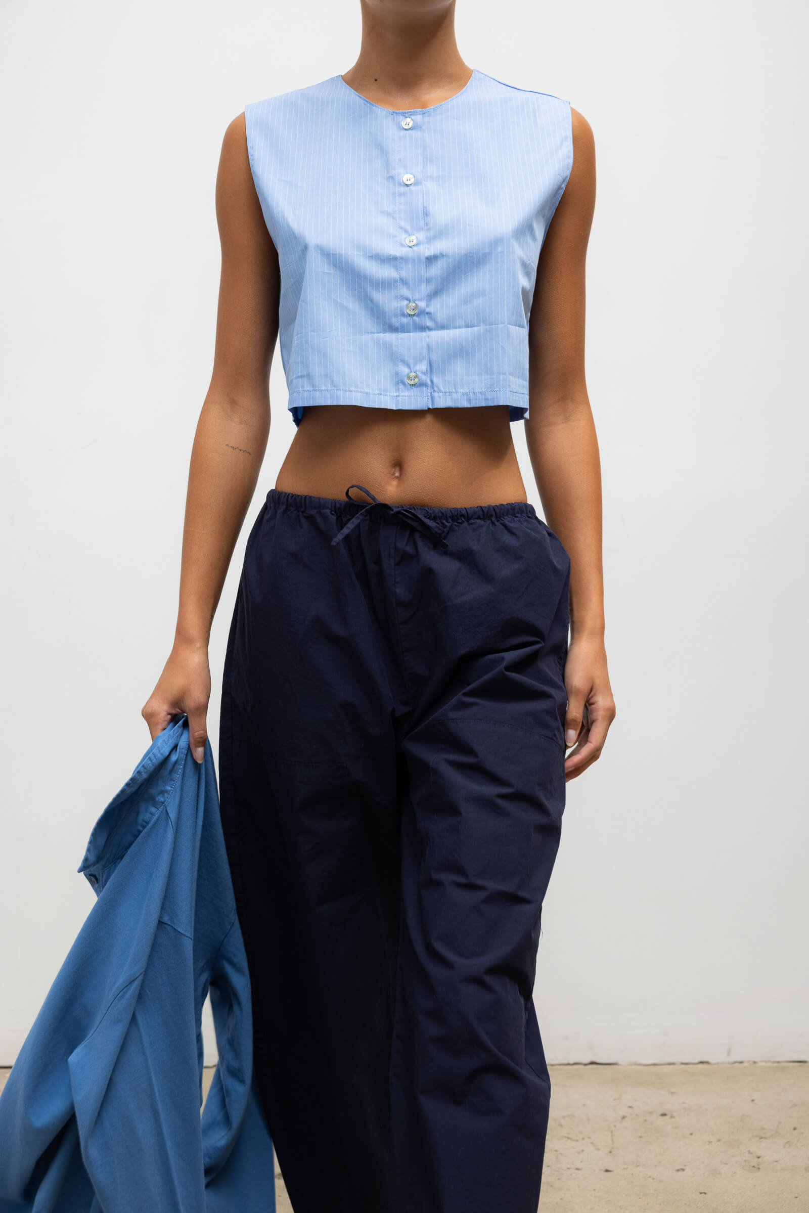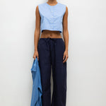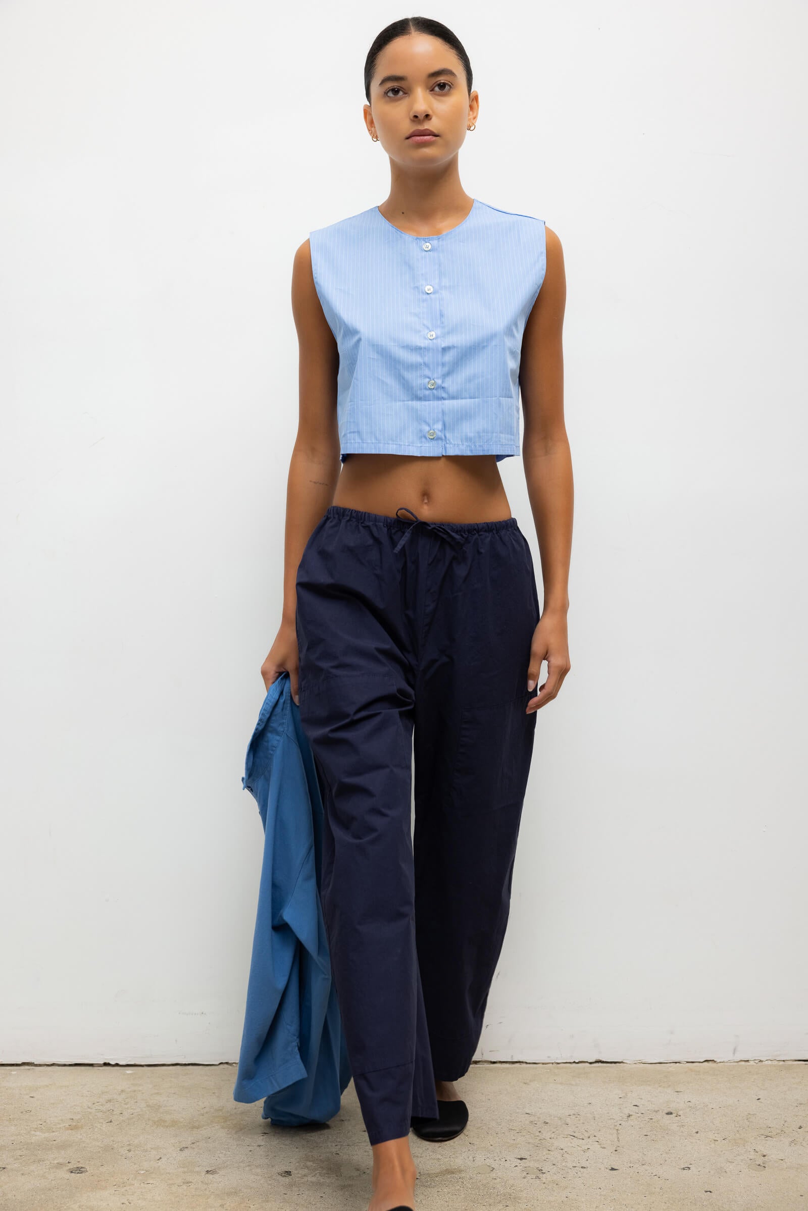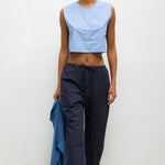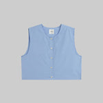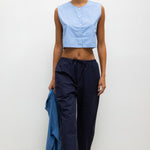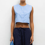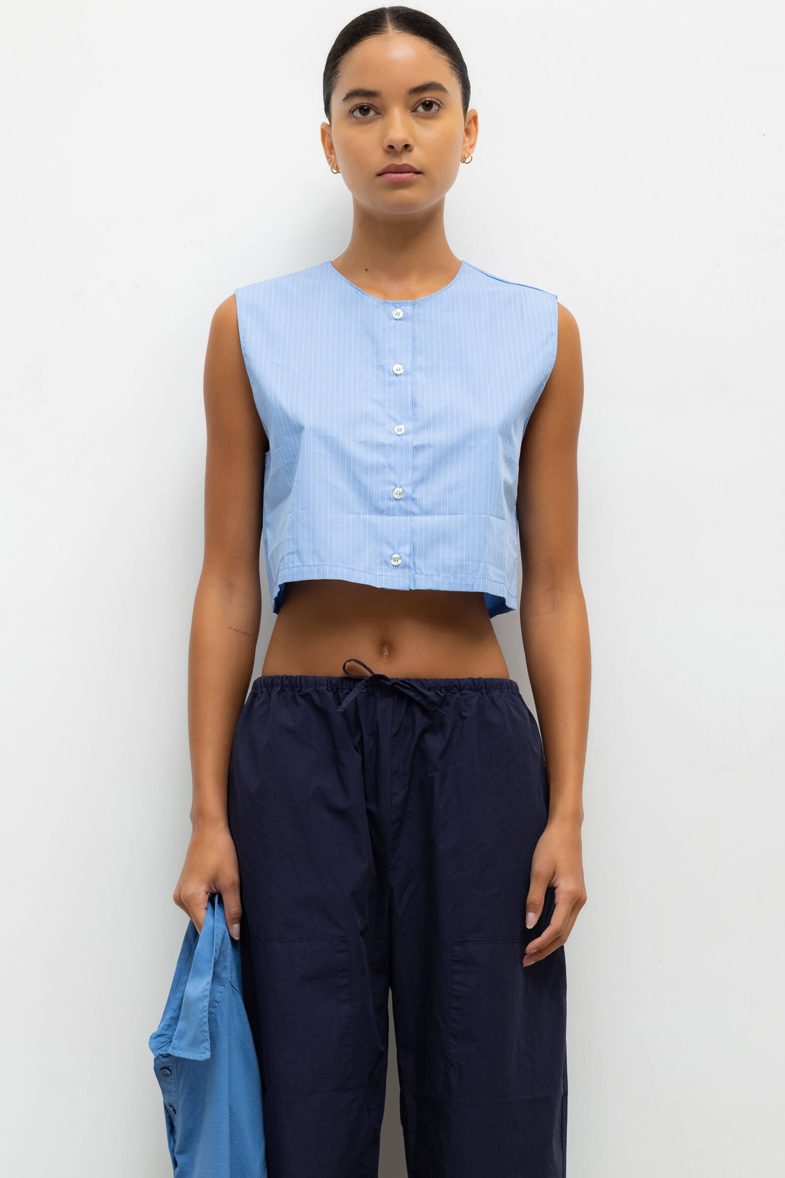 Cut in our striped Yoshi Cotton Twill, The Yoshi Crewneck Vest is a sleeveless silhouette, featuring a crew neckline, exposed button placket, and a cropped length. Make it a matching set with the Yoshi Drawstring Pant.
