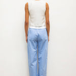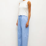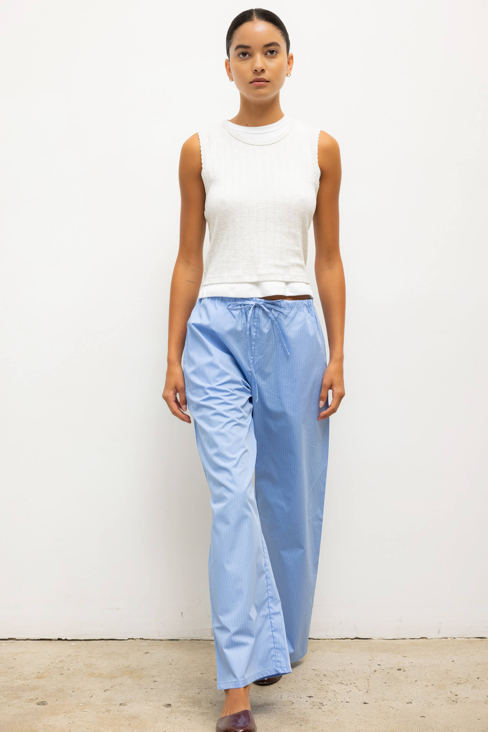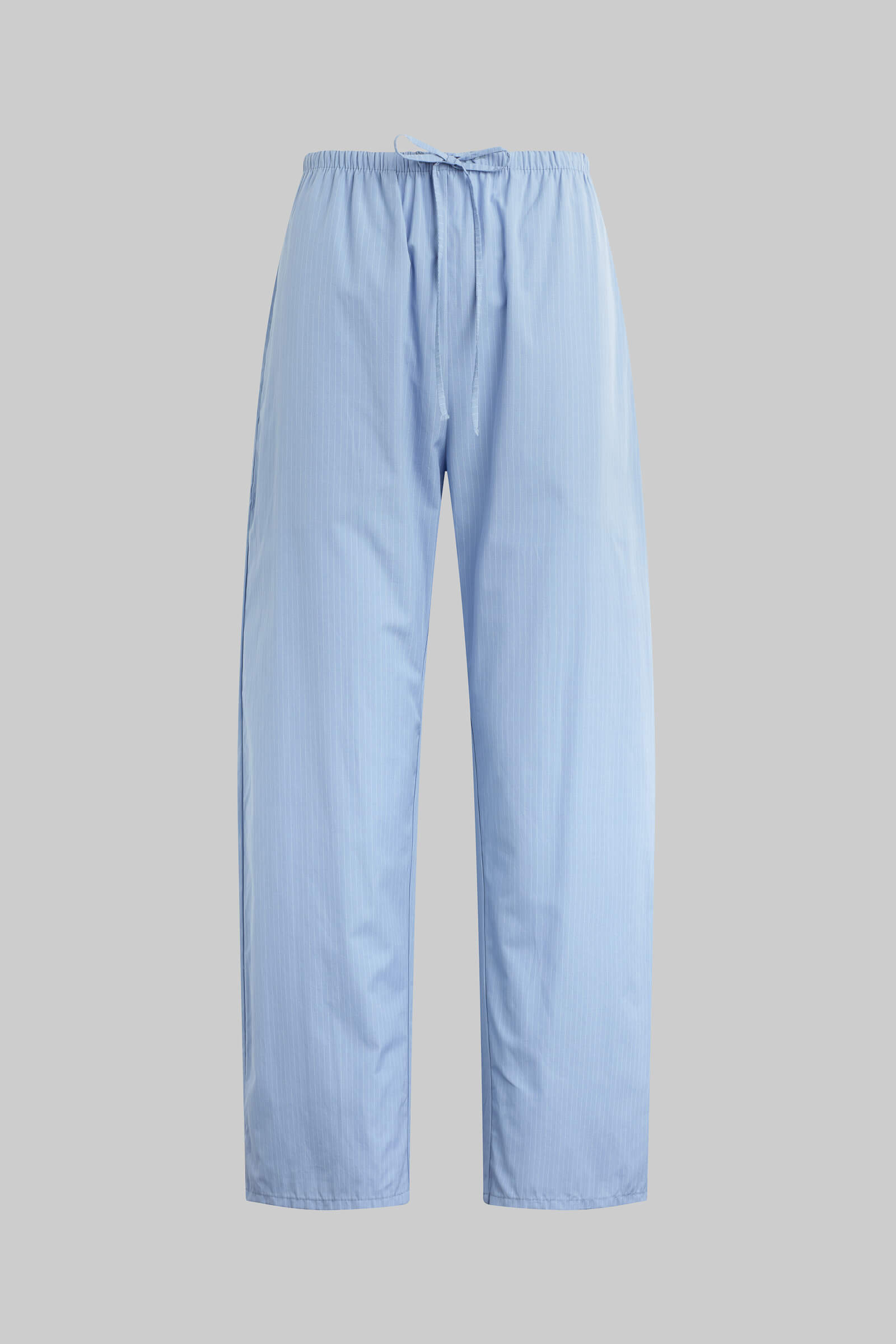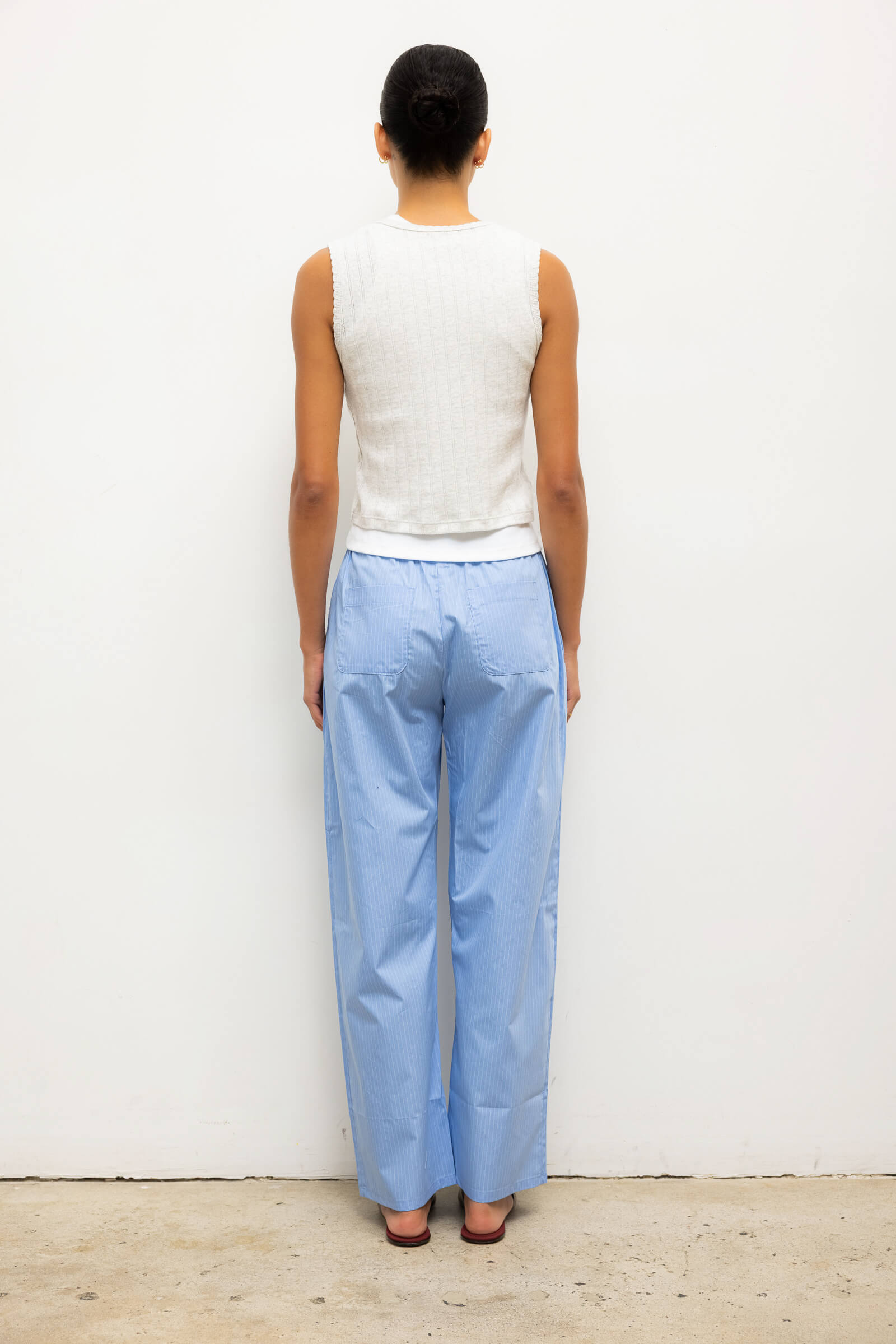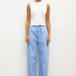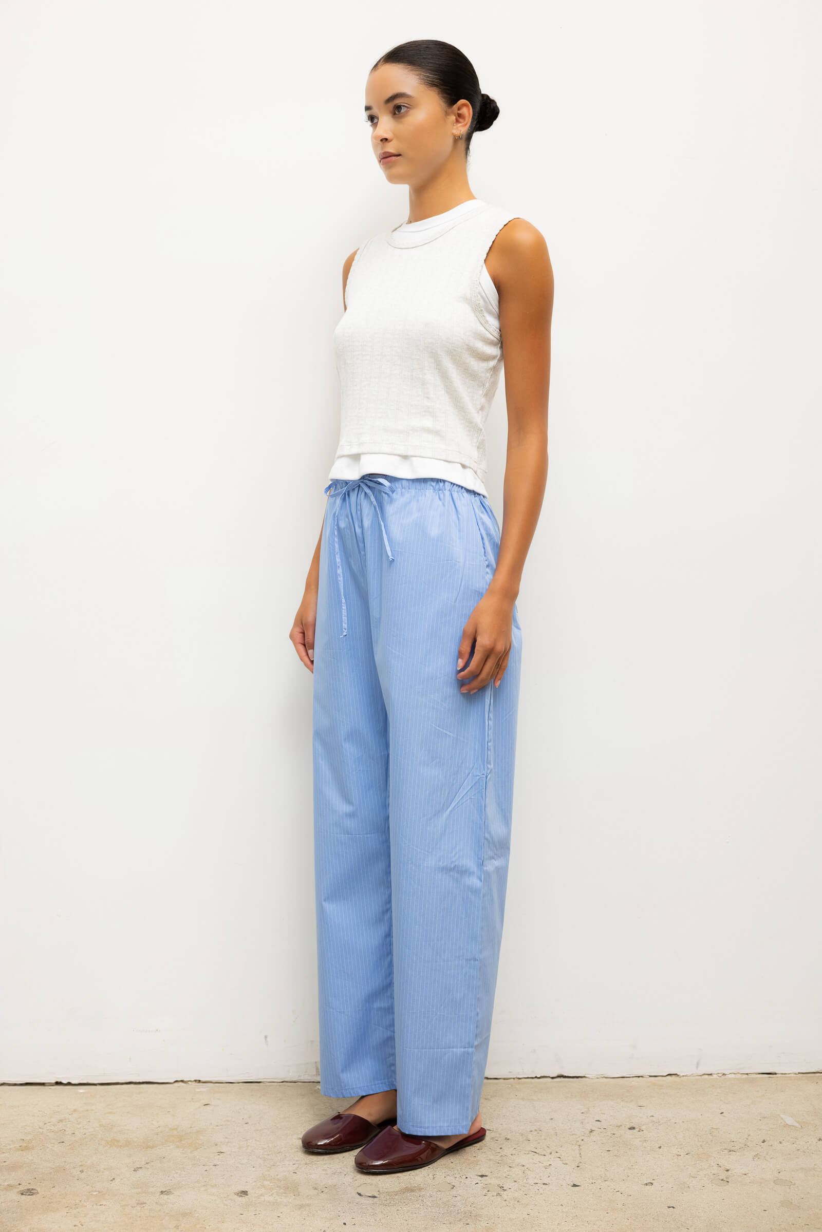Cut in our striped Yoshi Cotton Twill, The Yoshi Drawstring Pant features an adjustable drawstring waistband and a relaxed, straight leg silhouette. We're wearing these from bed to beach to bar - paired with The Yoko Crewneck Vest, then mixed with The Classics.