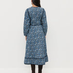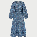 Midi dress in blue paisley floral cotton. Features a crew neckline, quilted detailing at the bodice and hem, balloon sleeves, and ties at the waist for a flattering fit.