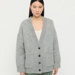 Cardigan in grey merino wool. Features a v-neckline, front patch pockets, ribbed edges, and a button closure. Designed for an oversized, boxy fit.
