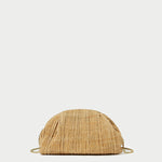 Pleated, dome-shaped pouch in natural raffia. Features a removable twisted gold metal chain strap, frame closure, full lining, and interior card slot.