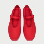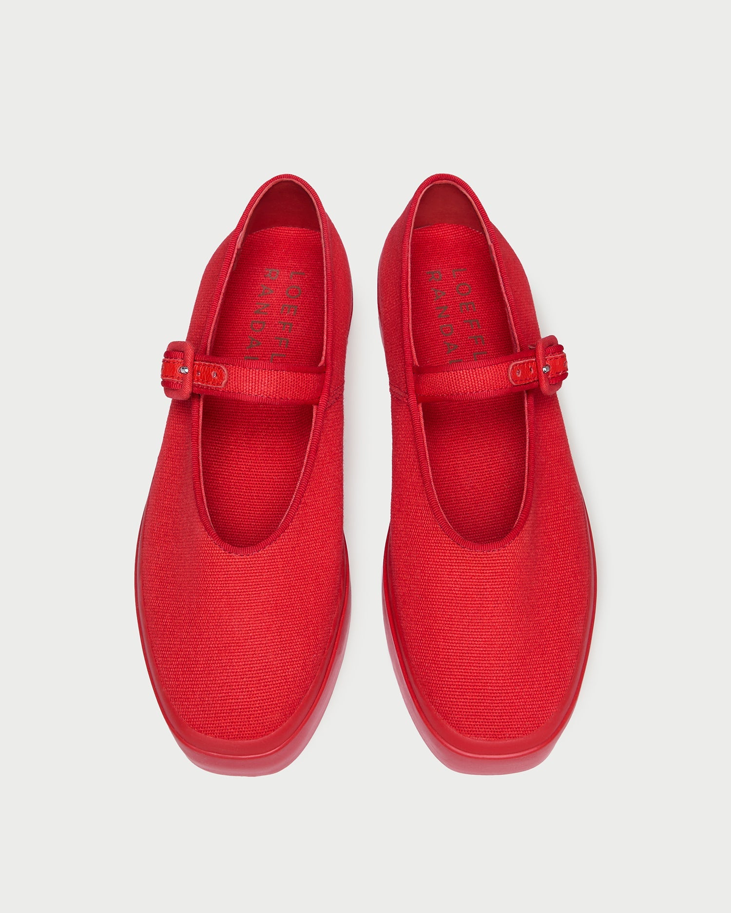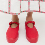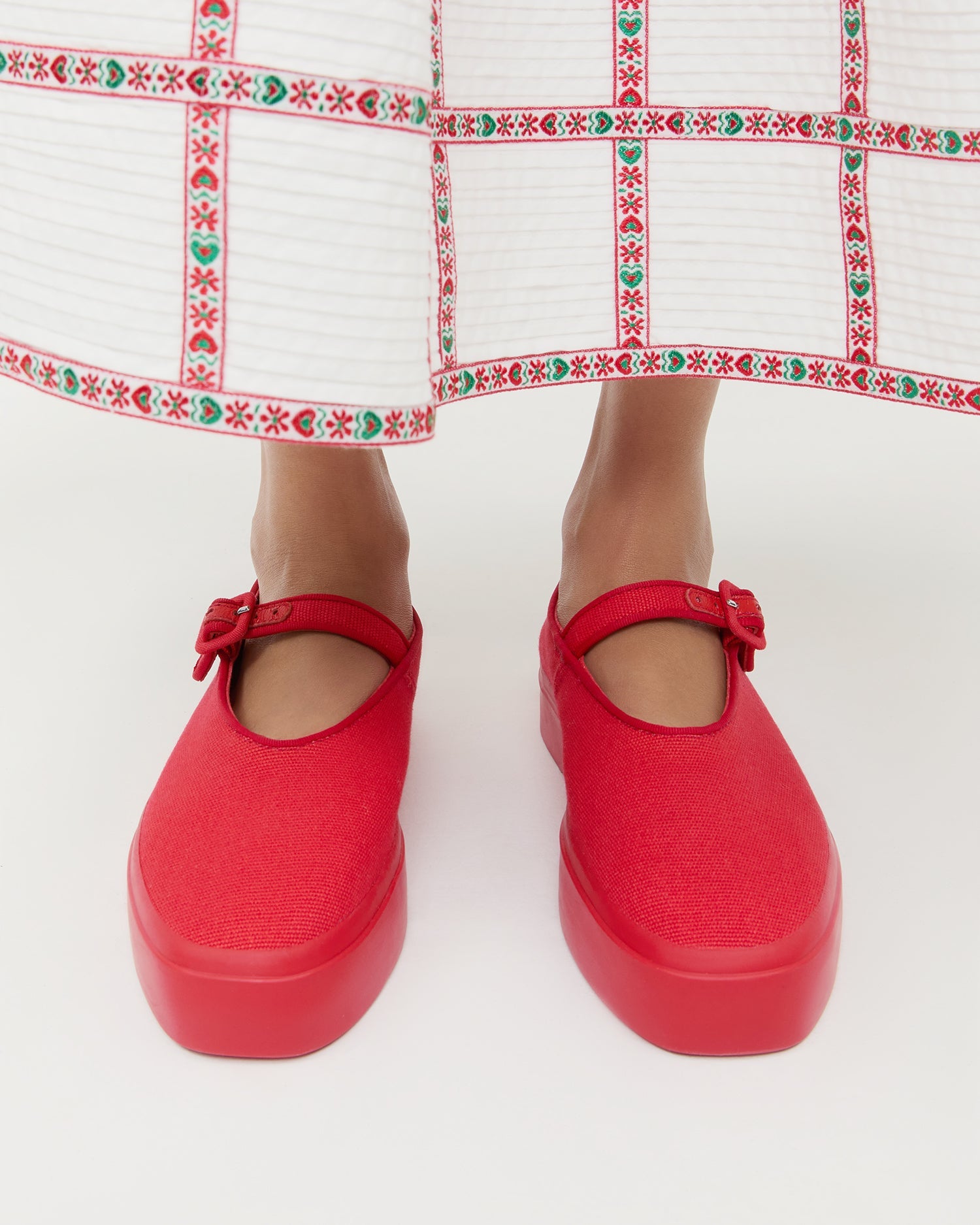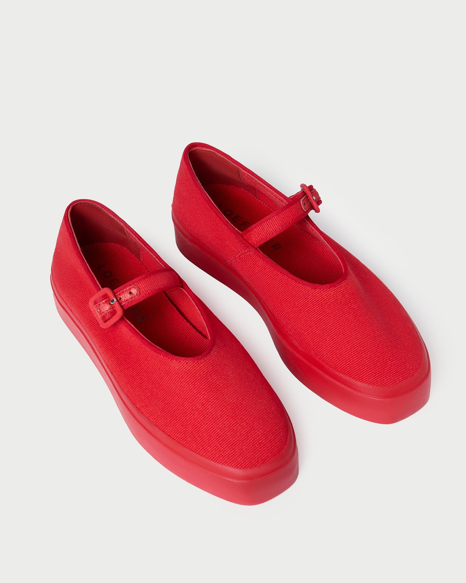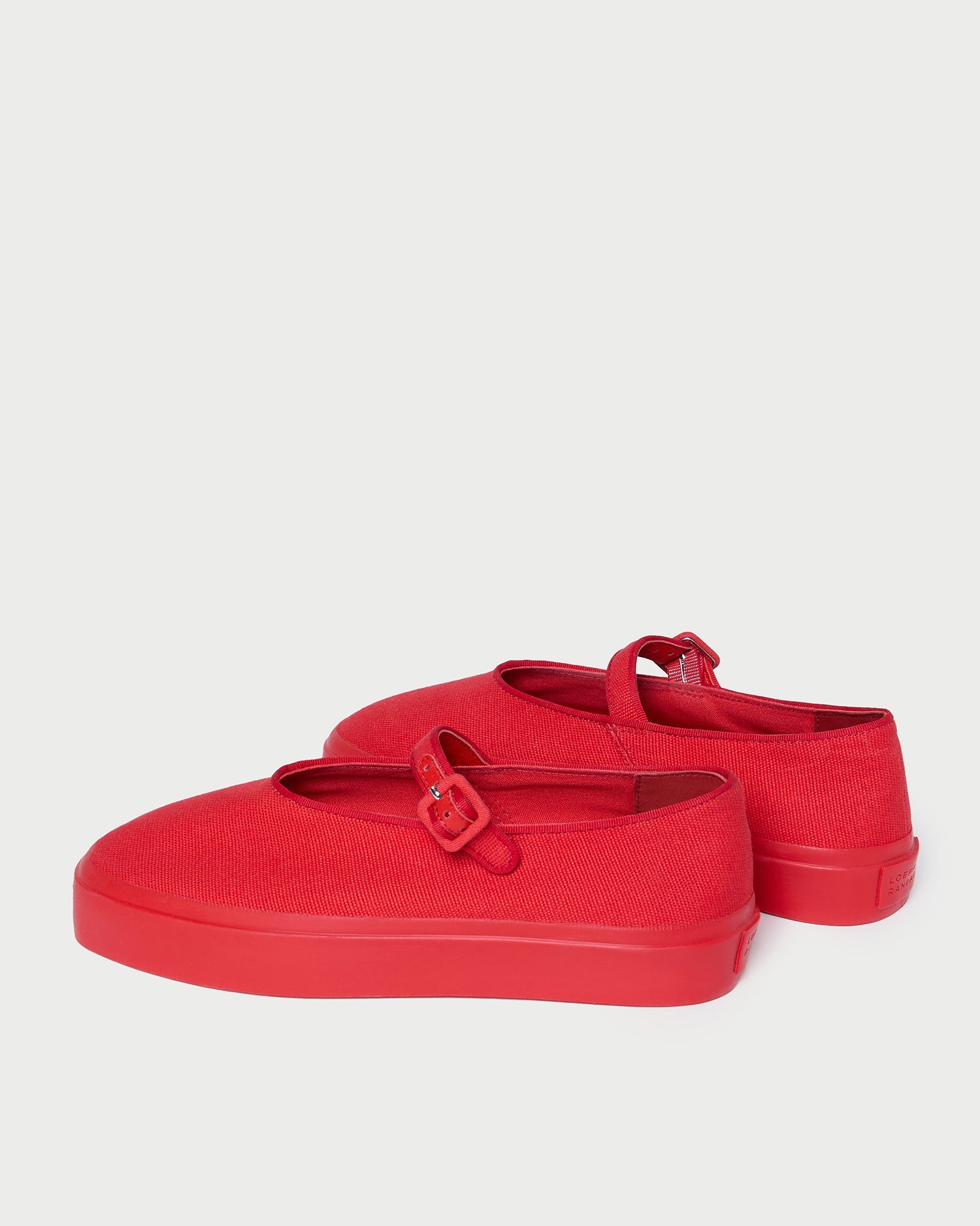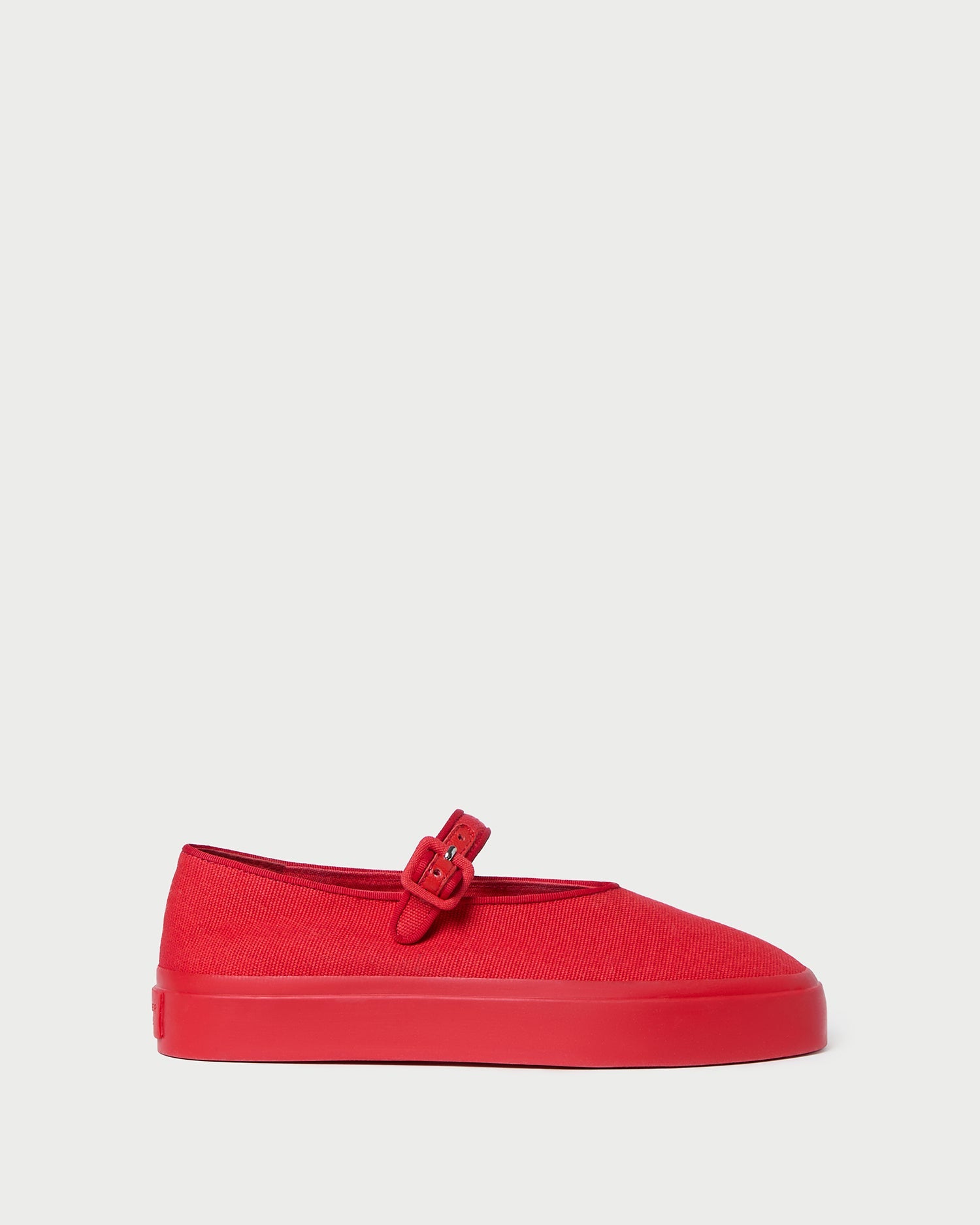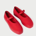 Mary Jane sneaker in red canvas. Features an adjustable bridge strap with a red buckle closure, a squared toe, and a 1-inch platform rubber sole.