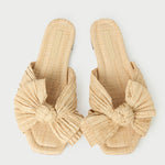 Pleated flat slide sandal in natural straw topped with our signature knotted bow. Features a padded footbed with gold stamped logo and an open, squared toe. Slips on. Made completely from vegan-friendly materials.
