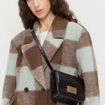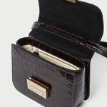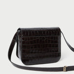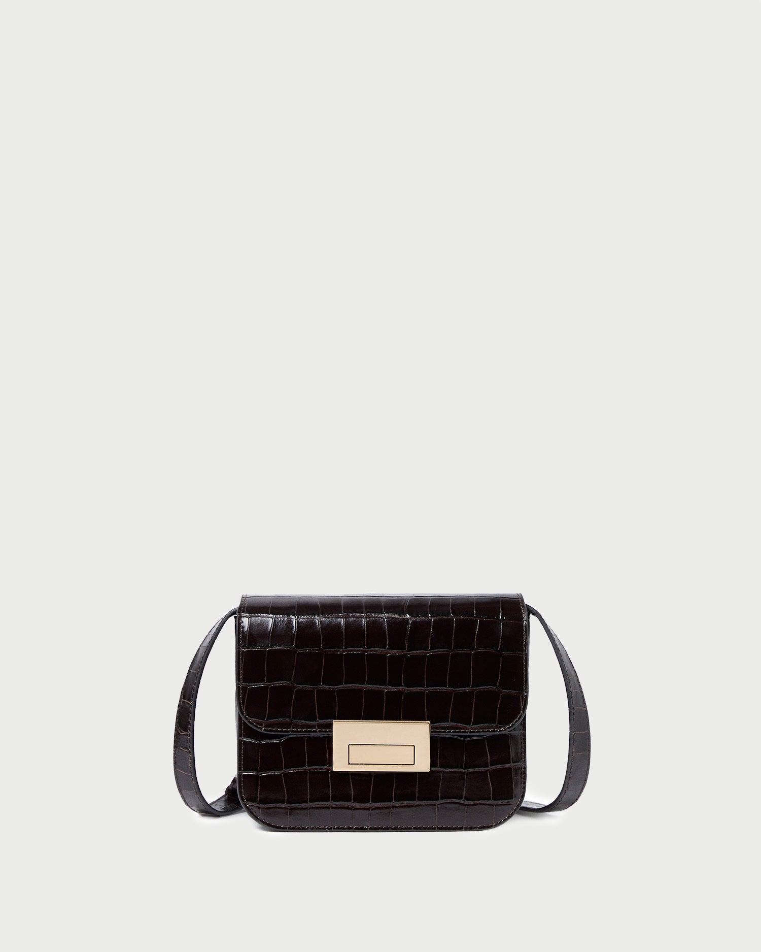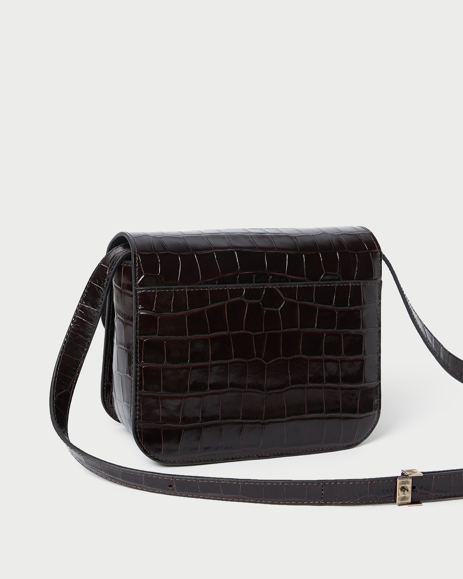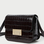 Crossbody in ebony crocodile-embossed leather. Features an adjustable strap, flap design, push lock closure, full lining, and gold stamped logo.