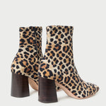 High heel ankle bootie in leopard jersey. Features a padded footbed with gold-stamped logo, round toe, and a concealed side zipper. 3-inch heel.