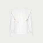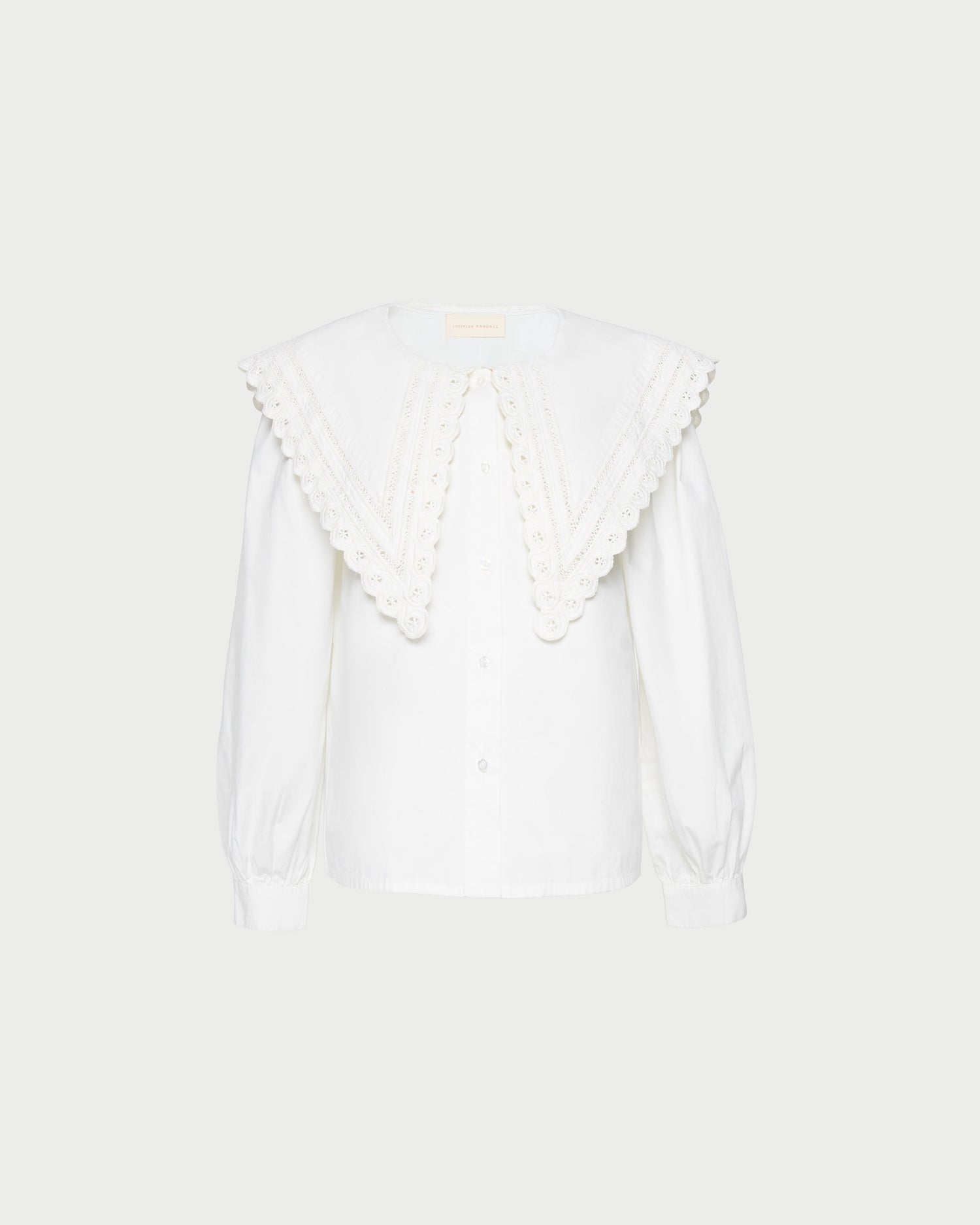Button-down shirt in milk-hued cotton poplin. Features custom embroidery on collar, bracelet-length sleeves, a boxy fit, and delicate flower buttons.