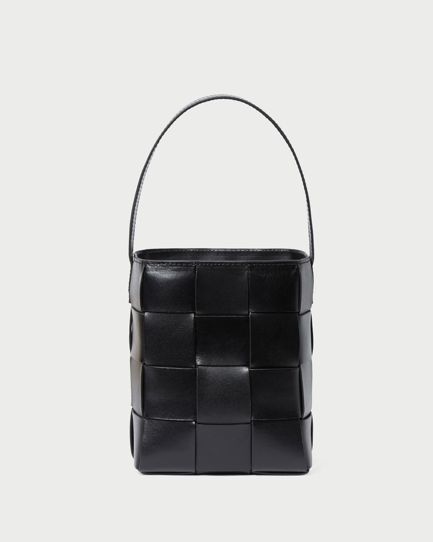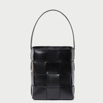 Small bucket bag in black wide woven vachetta leather. Features a vachetta leather strap, drawstring closure, and full lining.