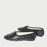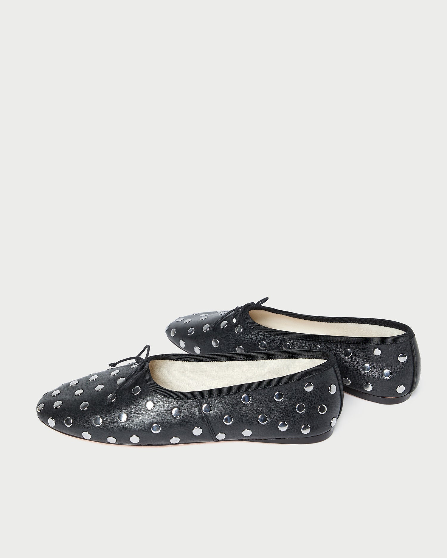 Soft ballet flat in black Italian nappa leather with nickel studs and bow detail. Features a padded leather footbed with gold stamped logo and an almond toe. Slips on.
