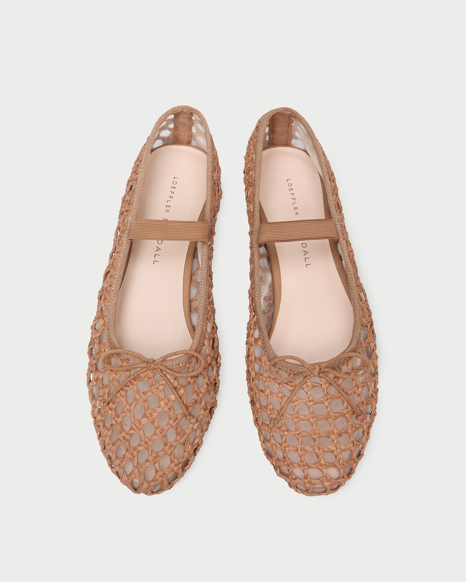 Soft ballet flat in brown crocheted raffia with an elastic bridge strap and bow detail. Features a padded footbed with gold stamped logo and an almond toe.