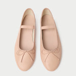 Soft ballet flat in ballet pink glove calf leather with elastic bridge strap and bow detail at toe. Padded footbed with stamped logo and leather sole.