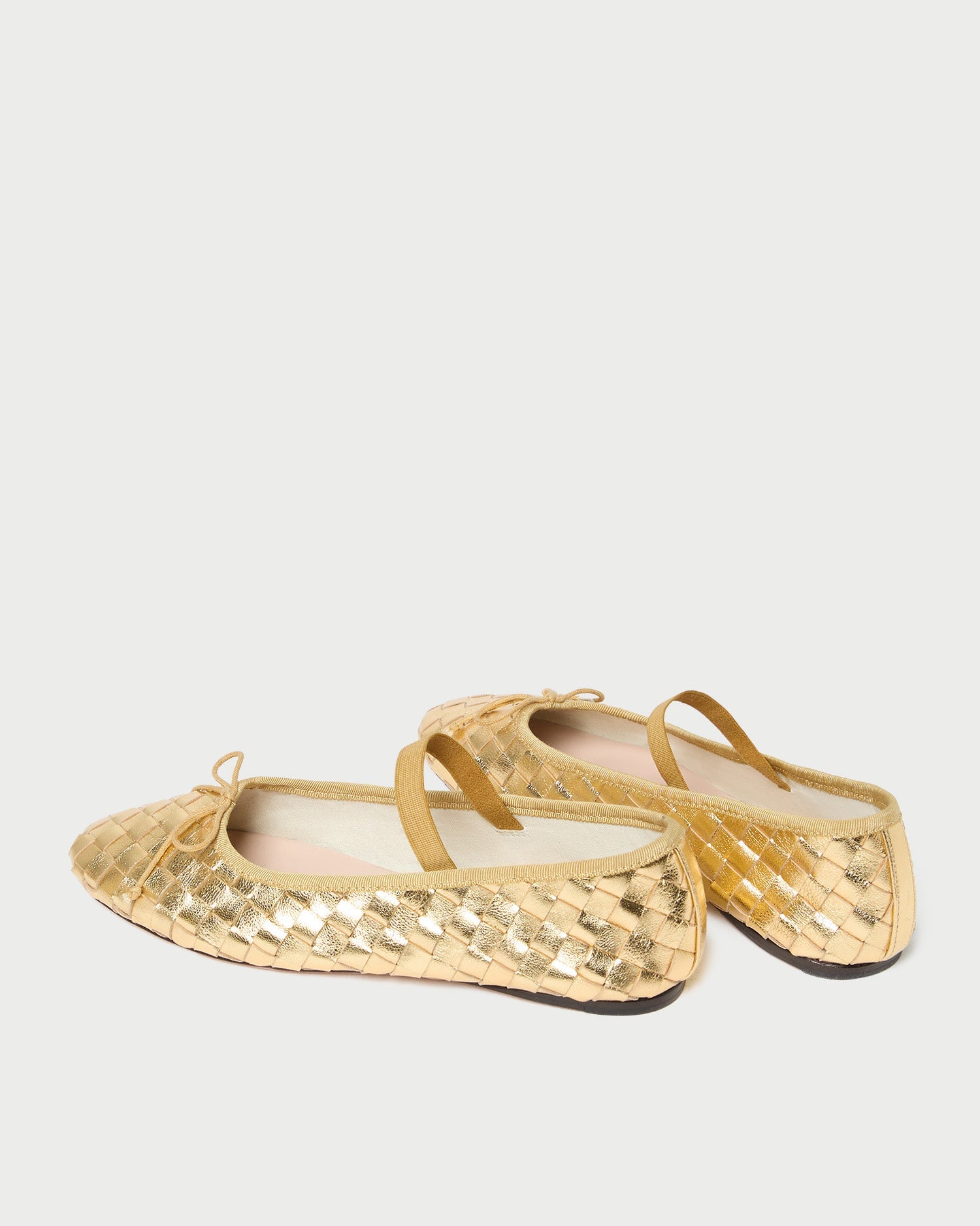 Soft ballet flat in gold metallic woven leather with an elastic bridge strap and bow detail. Features a padded footbed with gold stamped logo and an almond toe.