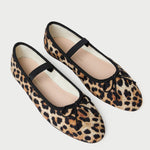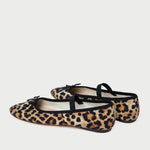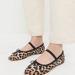 Soft ballet flat in leopard jersey. Features an almond toe, an elastic bridge strap, a bow detail, and a padded footbed with gold stamped logo. Slips on.