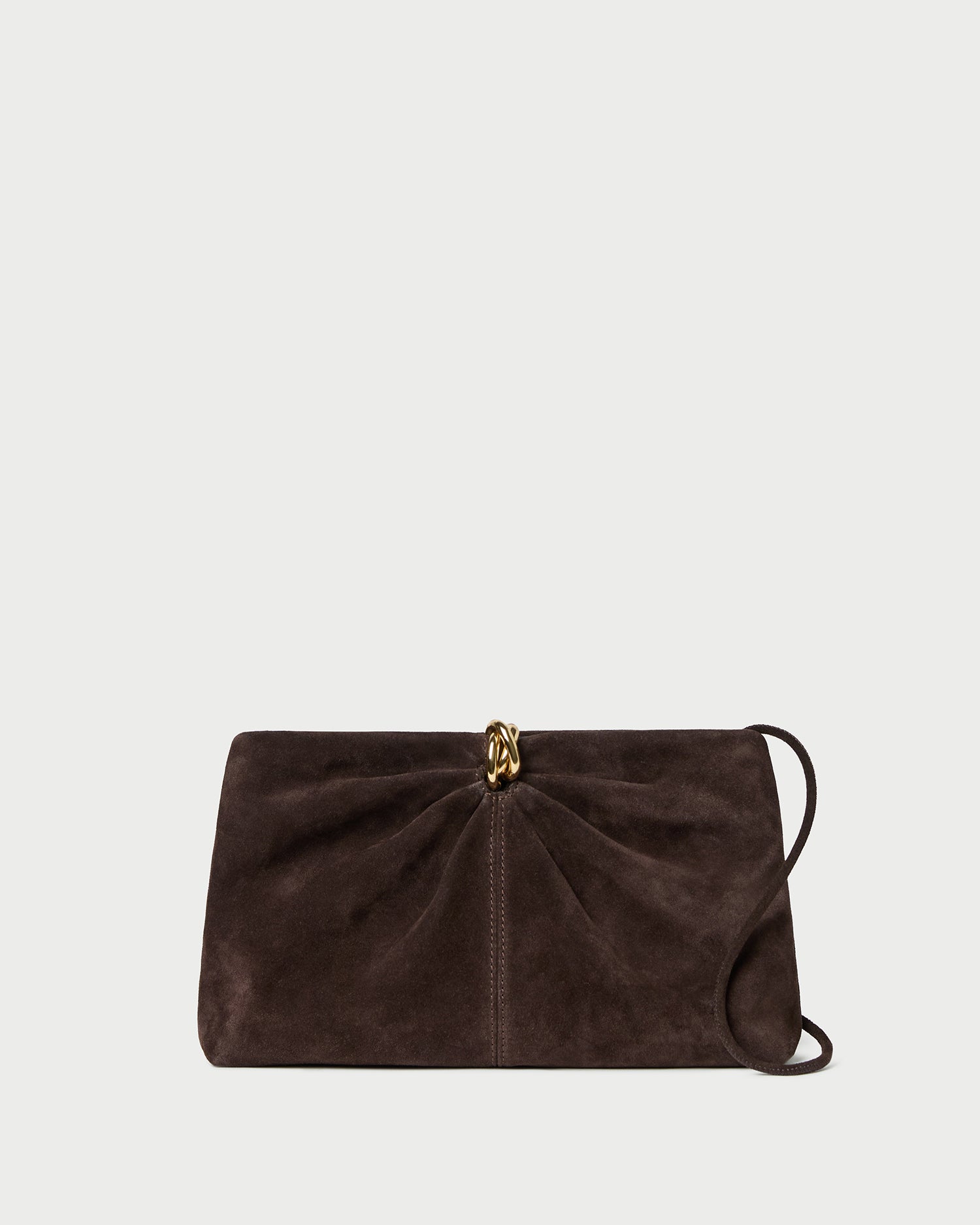 Clutch in brown gathered split suede. Features a multi-ring gold hardware accent, magnetic closure, lined interior, and a removable brown suede strap.