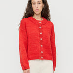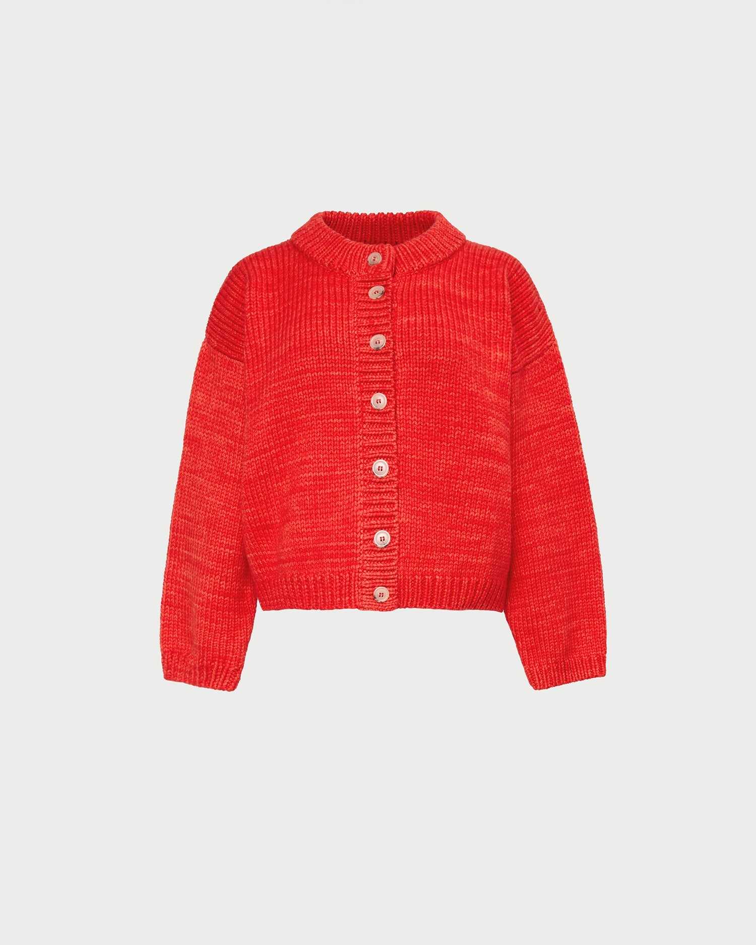 Mock-neck cardigan in red wool. Features tortoiseshell buttons and ribbing along the neckline, wrists, and hem.