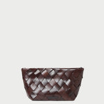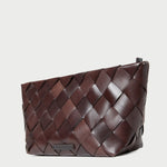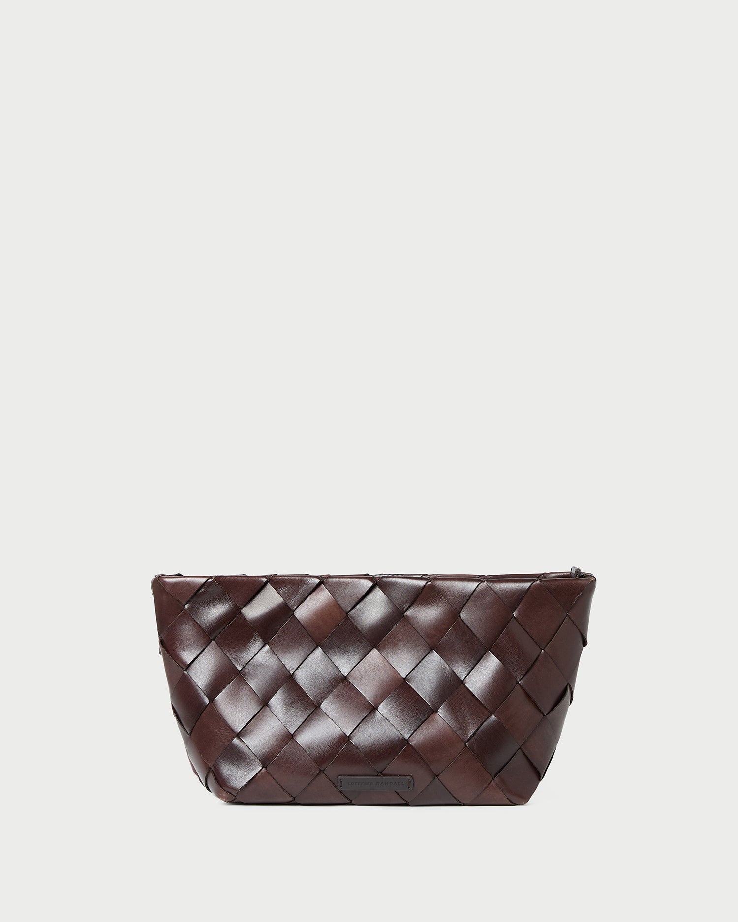 Clutch in chocolate woven leather. Features a zipper closure, cotton lining, and a blind embossed leather logo patch.