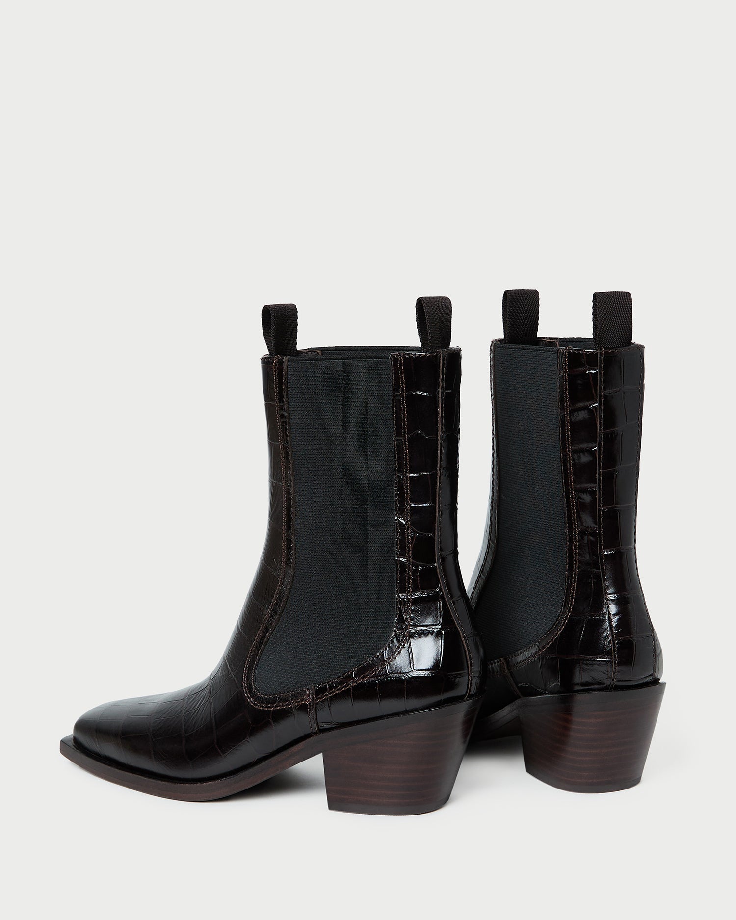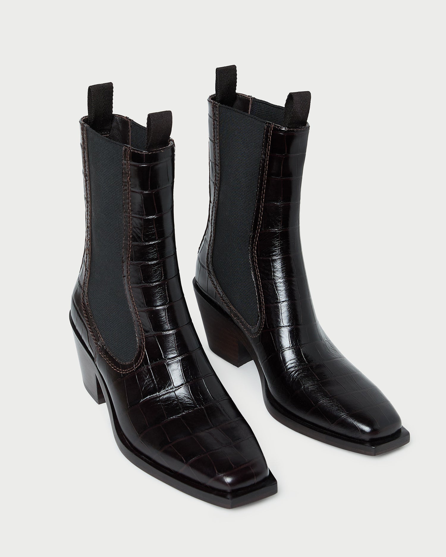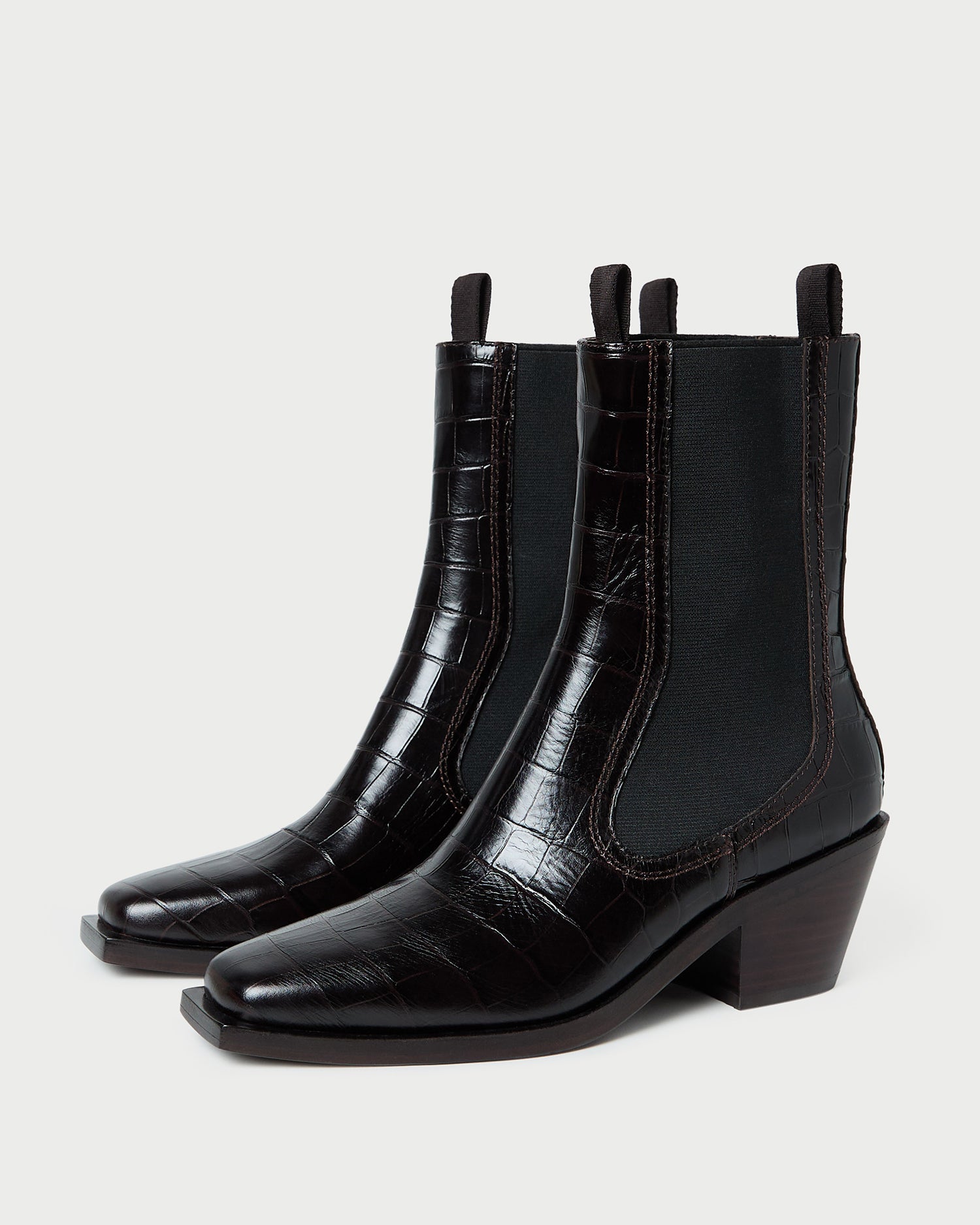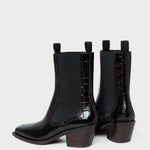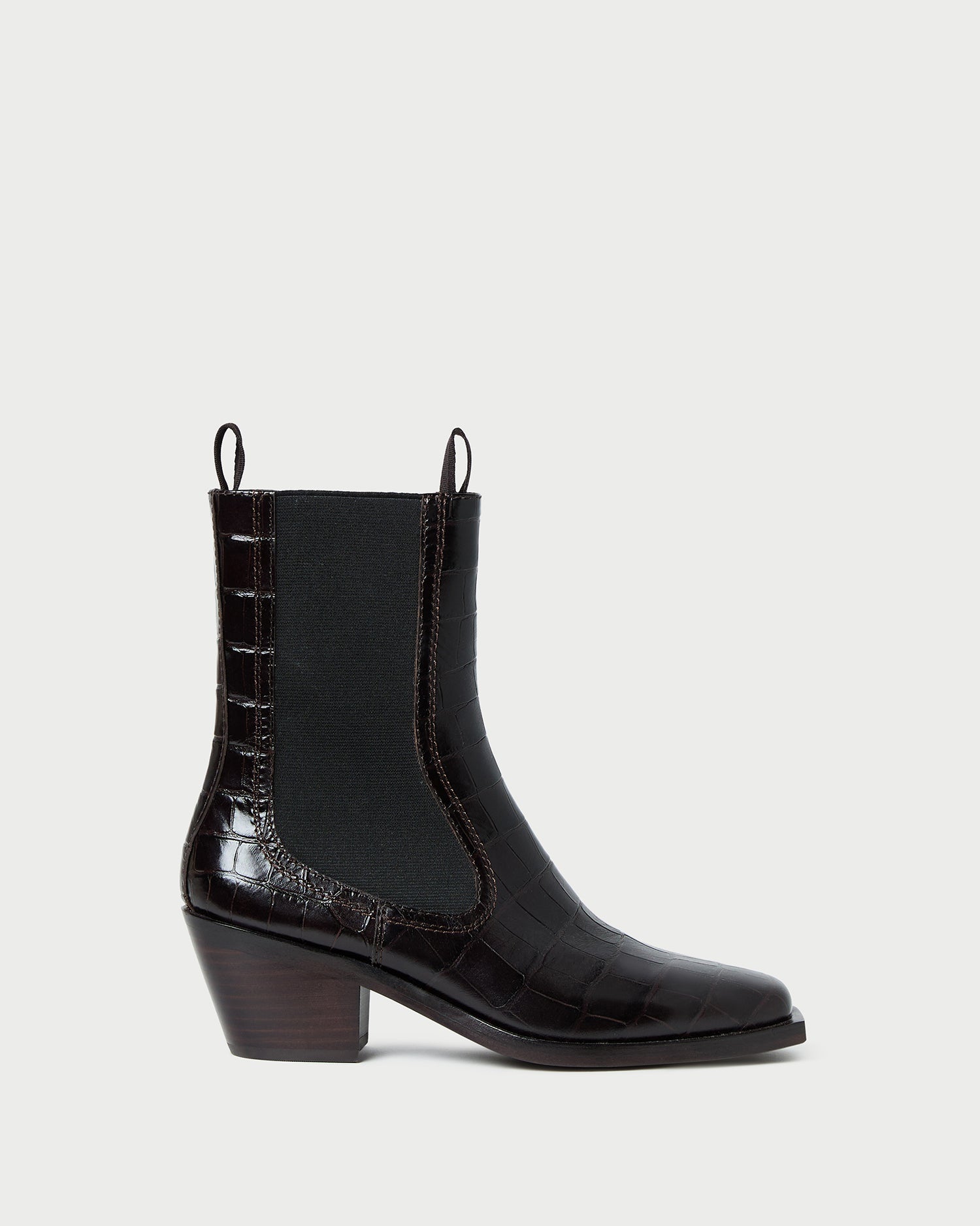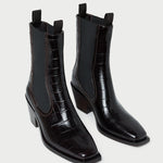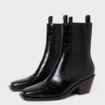 Mid-heel Western ankle boot in ebony crocodile-embossed leather. Features stretch gore panels, a padded footbed, and a square toe. Pulls on. 2-inch heel.
