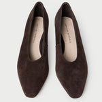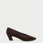 Mid-heel pump in brown suede. Features a pointed toe and a padded footbed with gold stamped logo. 2-inch heel.