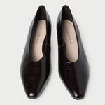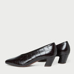 Mid-heel pump in ebony crocodile-embossed leather. Features a pointed toe and a padded footbed with gold stamped logo. 2-inch heel.
