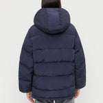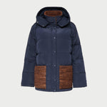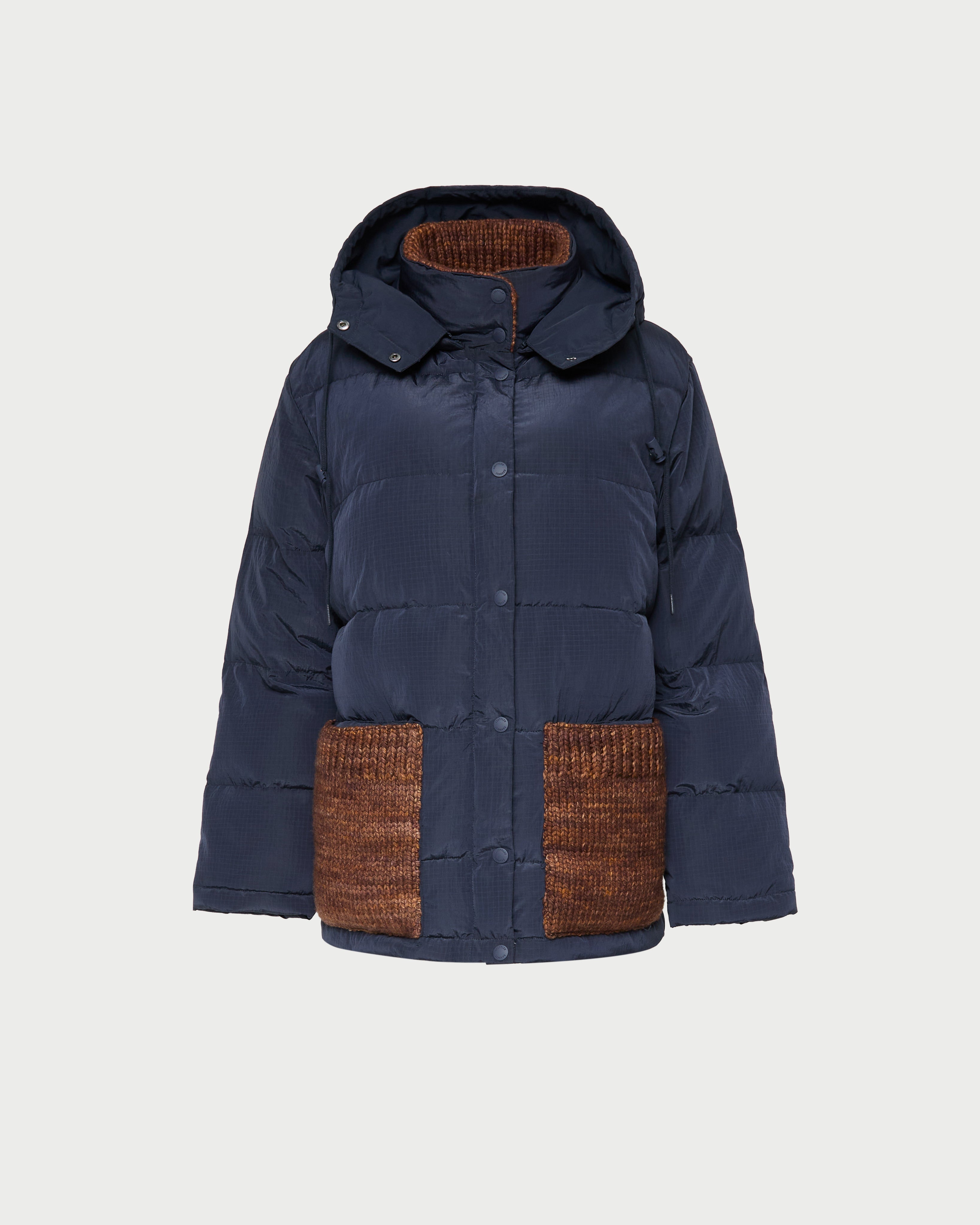 Mid-weight puffer coat in navy ribstop nylon with brown wool pockets. Features two knit pockets with front and side access, snap closures down the front, and an inside drawcord to adjust the fit of the waist. Hood is removable by a zipper and has an adjustable drawcord. Designed for an oversized fit.