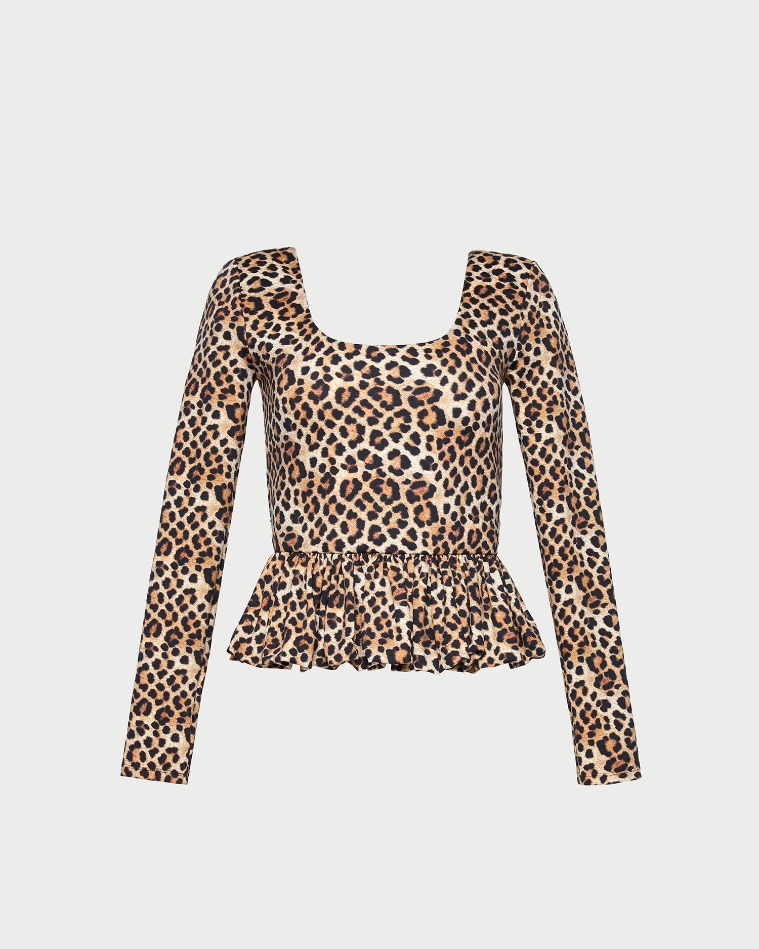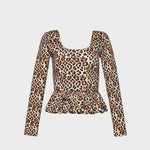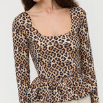 Peplum long-sleeve top in leopard stretch jersey. Features a scoop neck and ruffle trim at the hem.