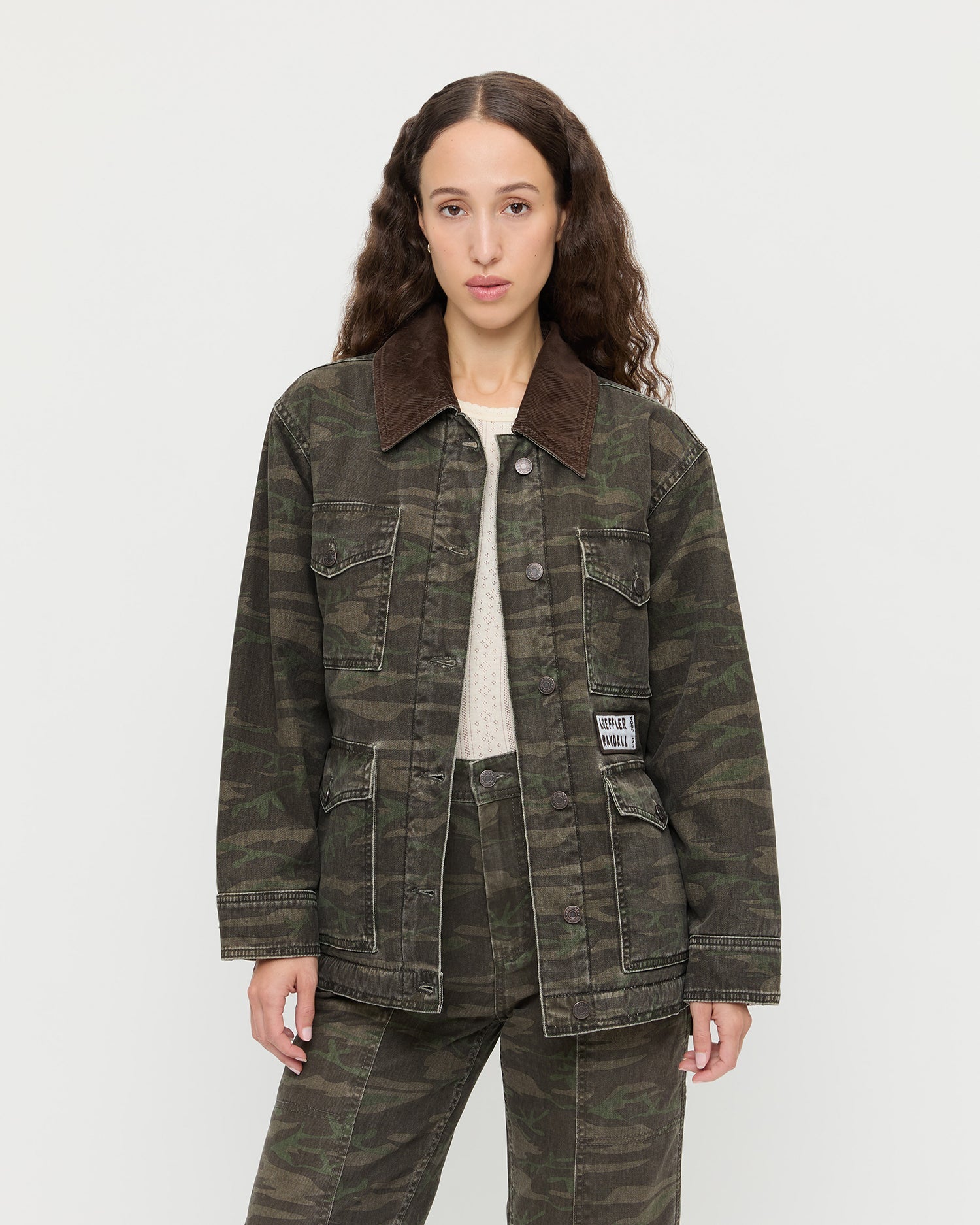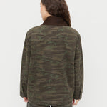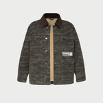 Workwear-inspired jacket in camo-printed denim with a dark brown corduroy collar. Features cream sherpa lining, four front patch pockets, side pockets, and a cotton logo patch. Designed for an oversized fit.