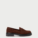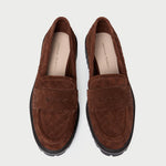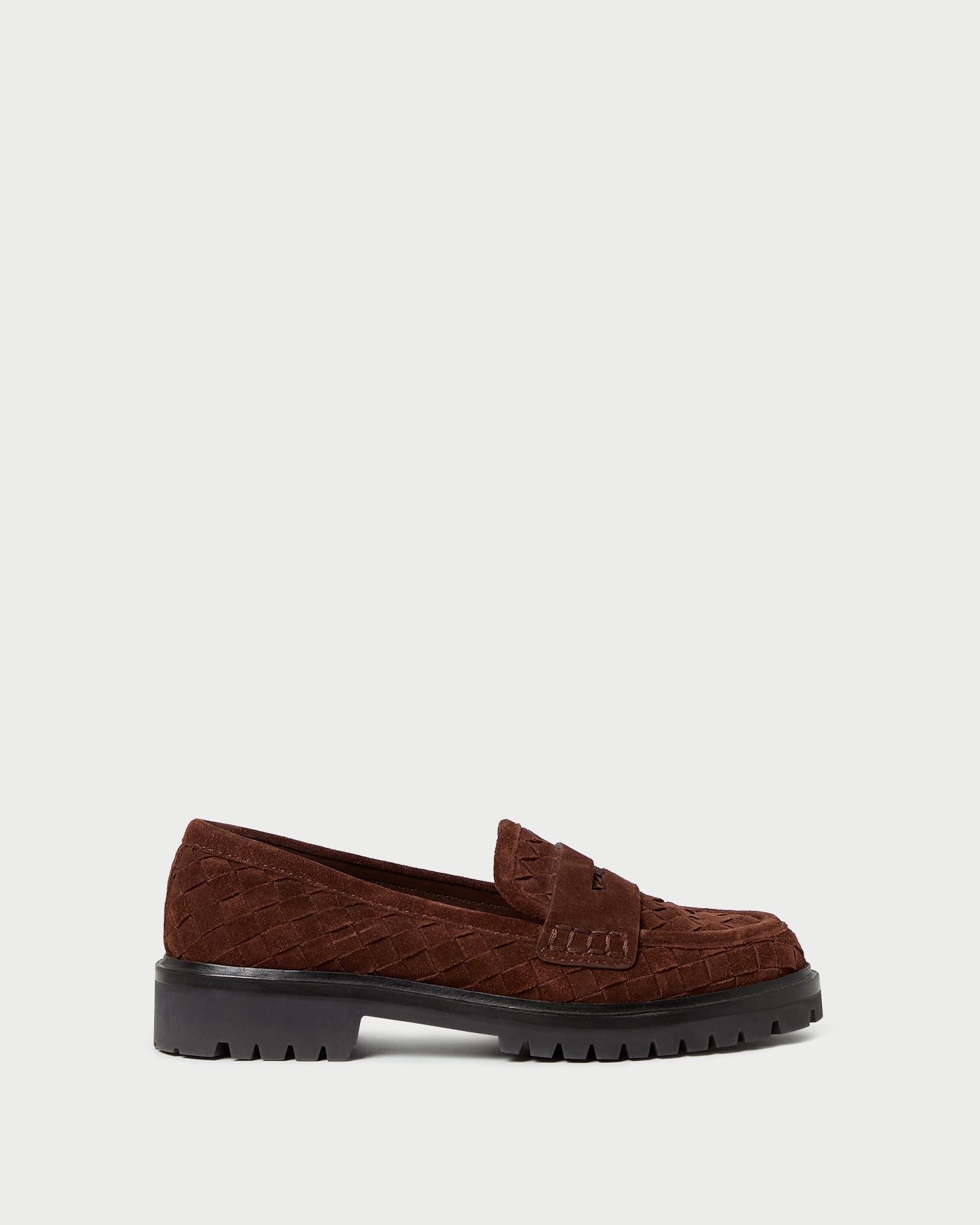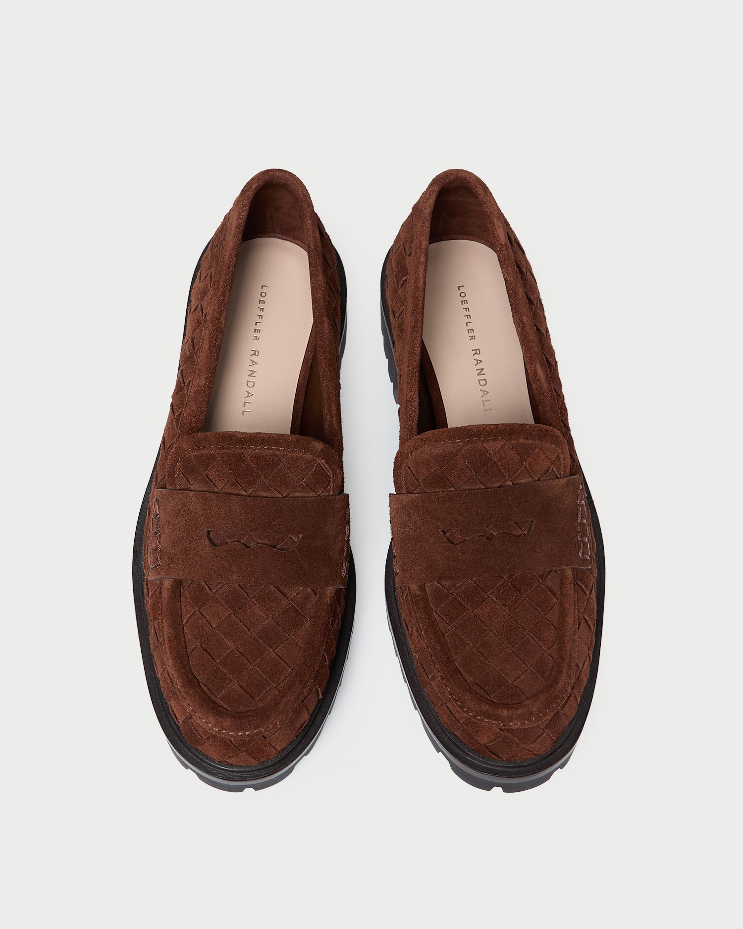 Loafer in espresso woven split suede. Features a chunky lug sole, a round toe, and a padded footbed with gold stamped logo. Slip on.