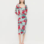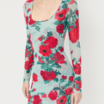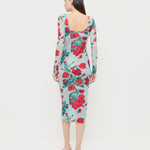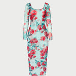 Long-sleeve midi dress in mint floral mesh fabric. Features a scoop neck, body-hugging fit, and hidden side zipper. Lined.