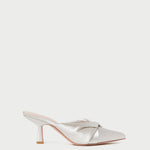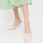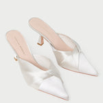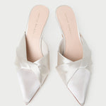 Mid-heel mule in cream satin. Features a twisted knot detail, a pointed closed toe, and a padded footbed. Slips on. 2.75-inch heel.