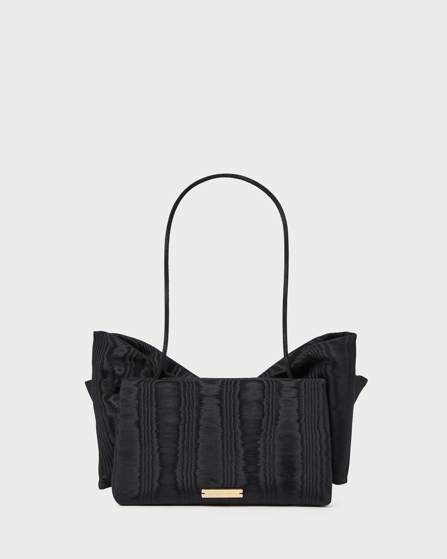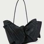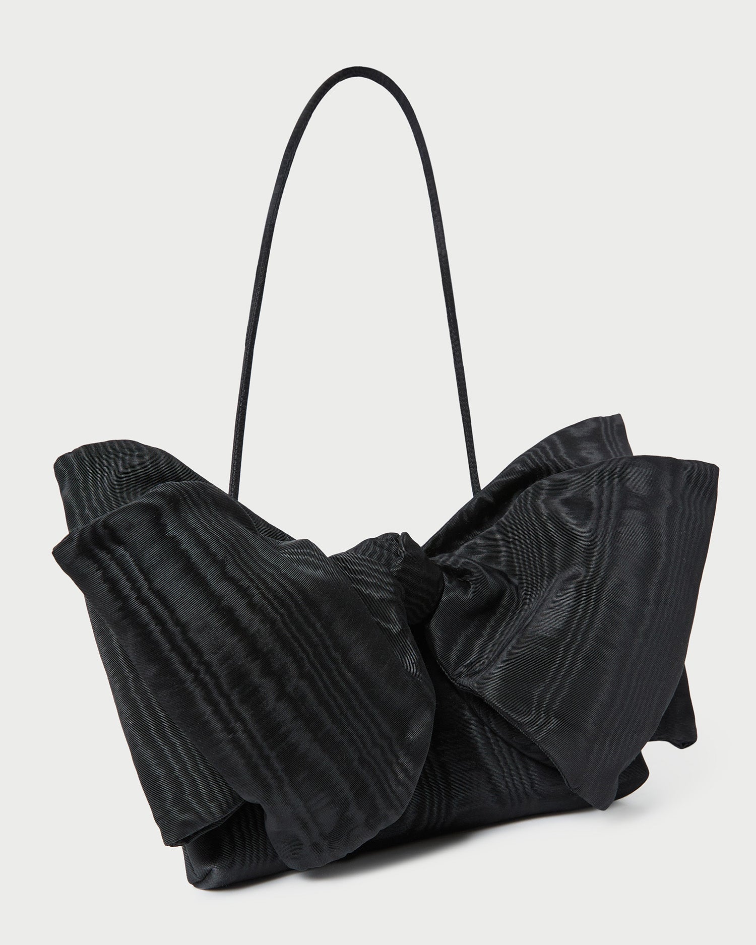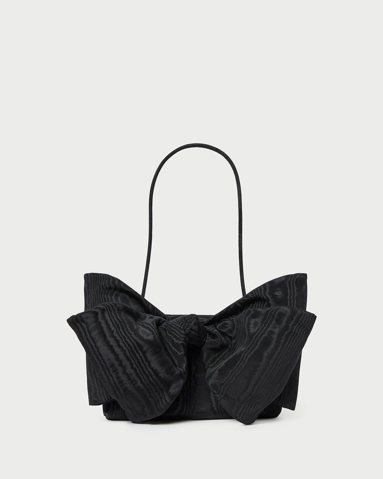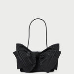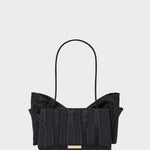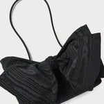 Shoulder bag in black Italian moiré with a statement bow. Features a shoulder strap, full lining, magnetic closure, and exterior metal logo plaque.