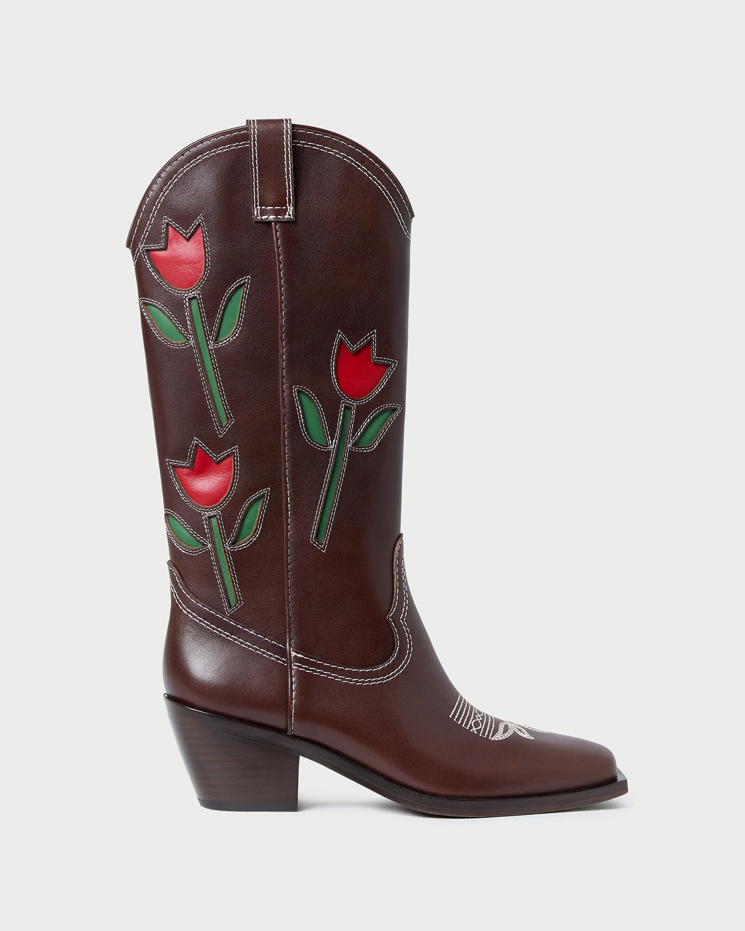 Tall western-inspired boot in espresso vachetta leather with red and green tulip inlay detailing. Features a padded leather footbed with gold stamped logo. Pulls on. 2.5-inch heel.