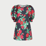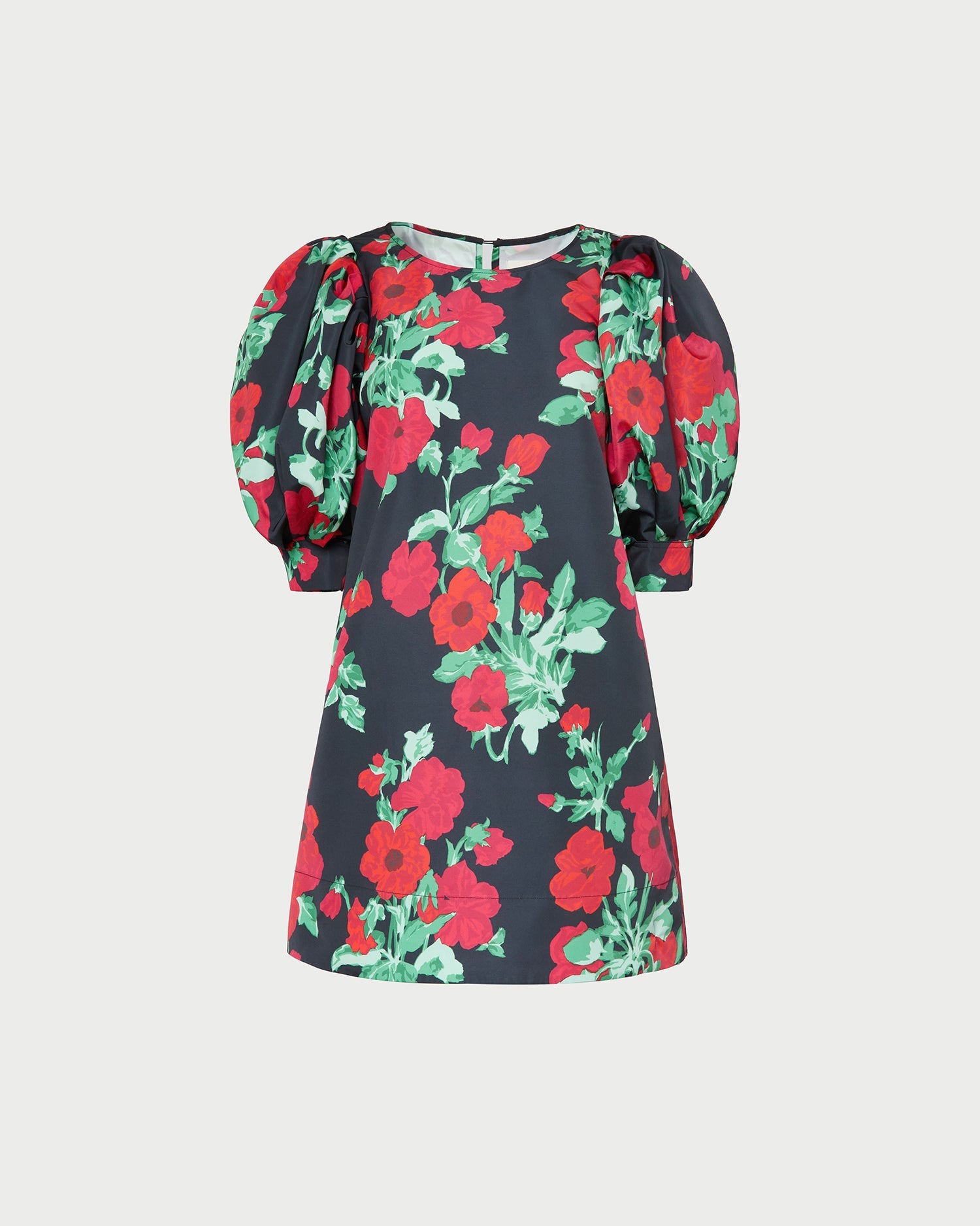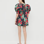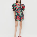 Mini dress in black floral faille material. Features puff sleeves, a loose, easy fit through the skirt, and a rounded neck with a keyhole button closure.