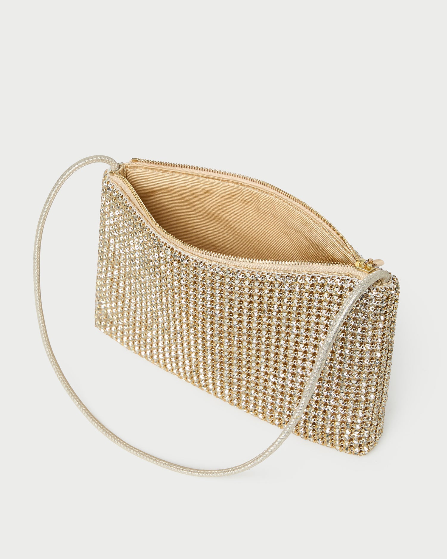 Compact clutch in gold diamanté. Features a full lining, a zipper closure, and an exterior metal logo plaque.