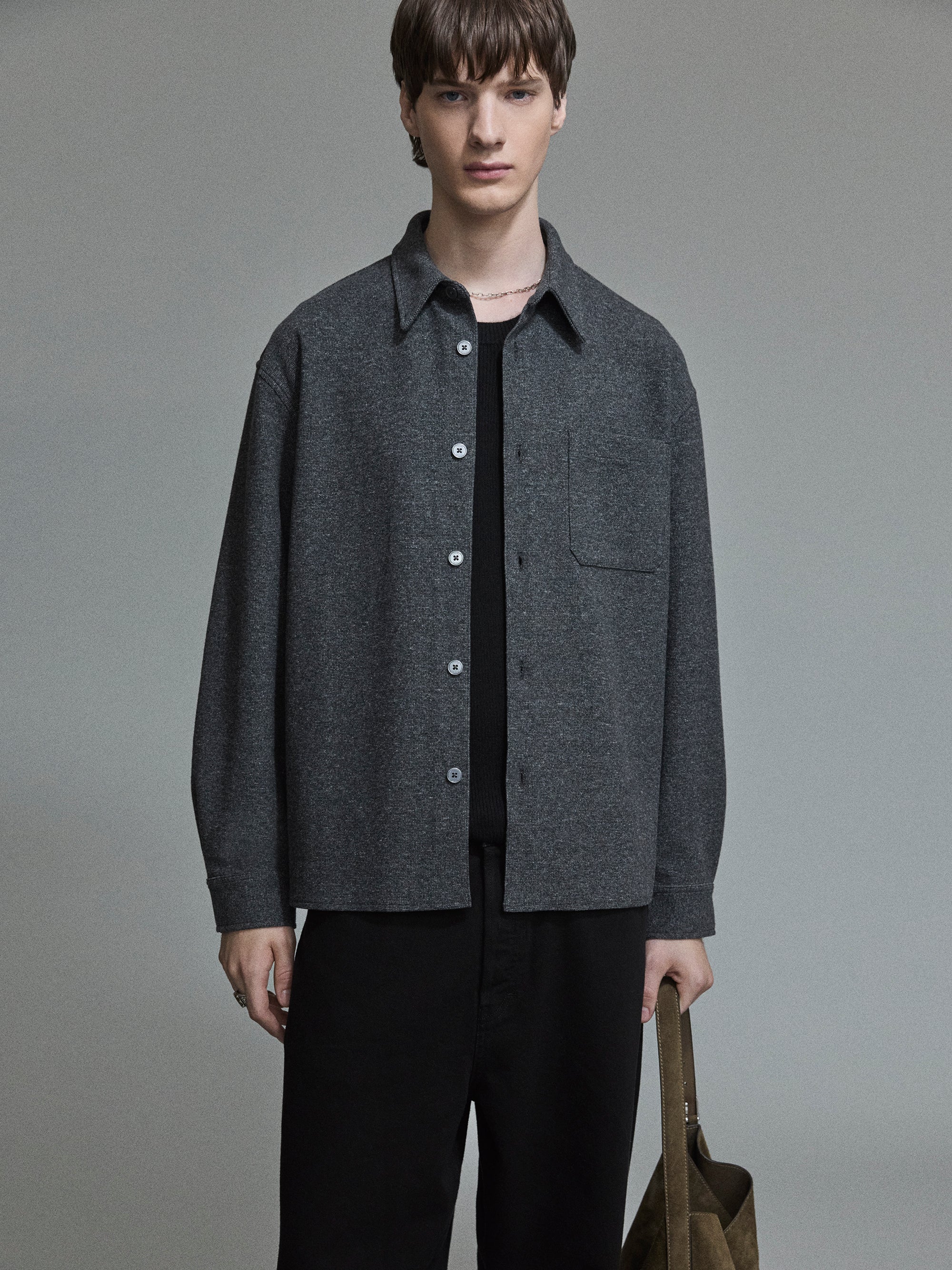 An easy, wearable button down with textural interest, crafted in a cotton blend in classic heather grey.