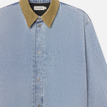 A heavyweight denim overshirt with a pointed suede collar and relaxed fit. An elevated essential with subtle Western cues.