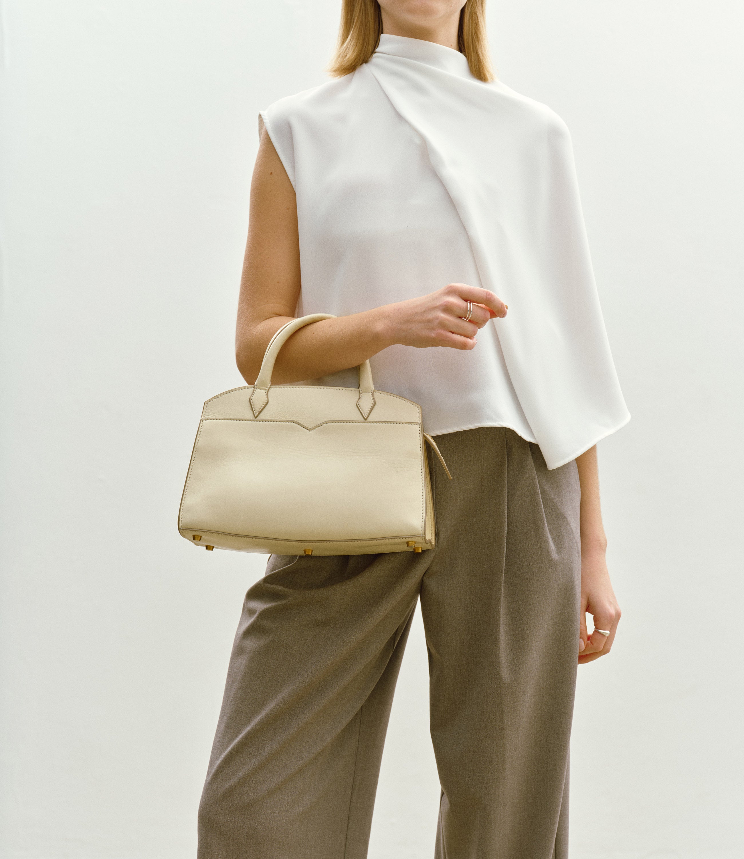 The Pendulum 30 is a slim and compact handbag, featuring a pared-back design and minimal seams for a featherlight construction. Métier’s signature diamond motif appears in distinctive details, from the bag’s diamond-shaped handle points to a geometric notch in the front exterior pocket.