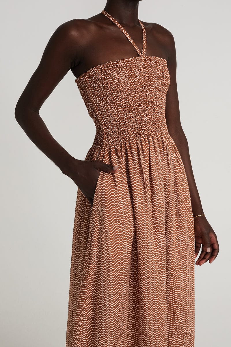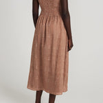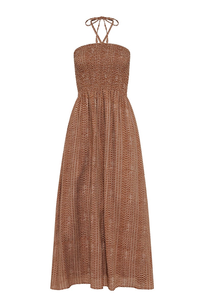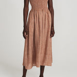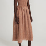 Youthful and airy, the Alyvia Maxi in our hand-printed Cocoa Vadella, encapsulates sunnier days. Fully lined and cut from our breathable, environmentally responsible linen fabrication, this piece features a comfortable shirred bodice, thin halter straps and gathered maxi length skirt. Complete the look with our Vintage White Gael Bucket Hat and Paloma Tote Bag.