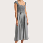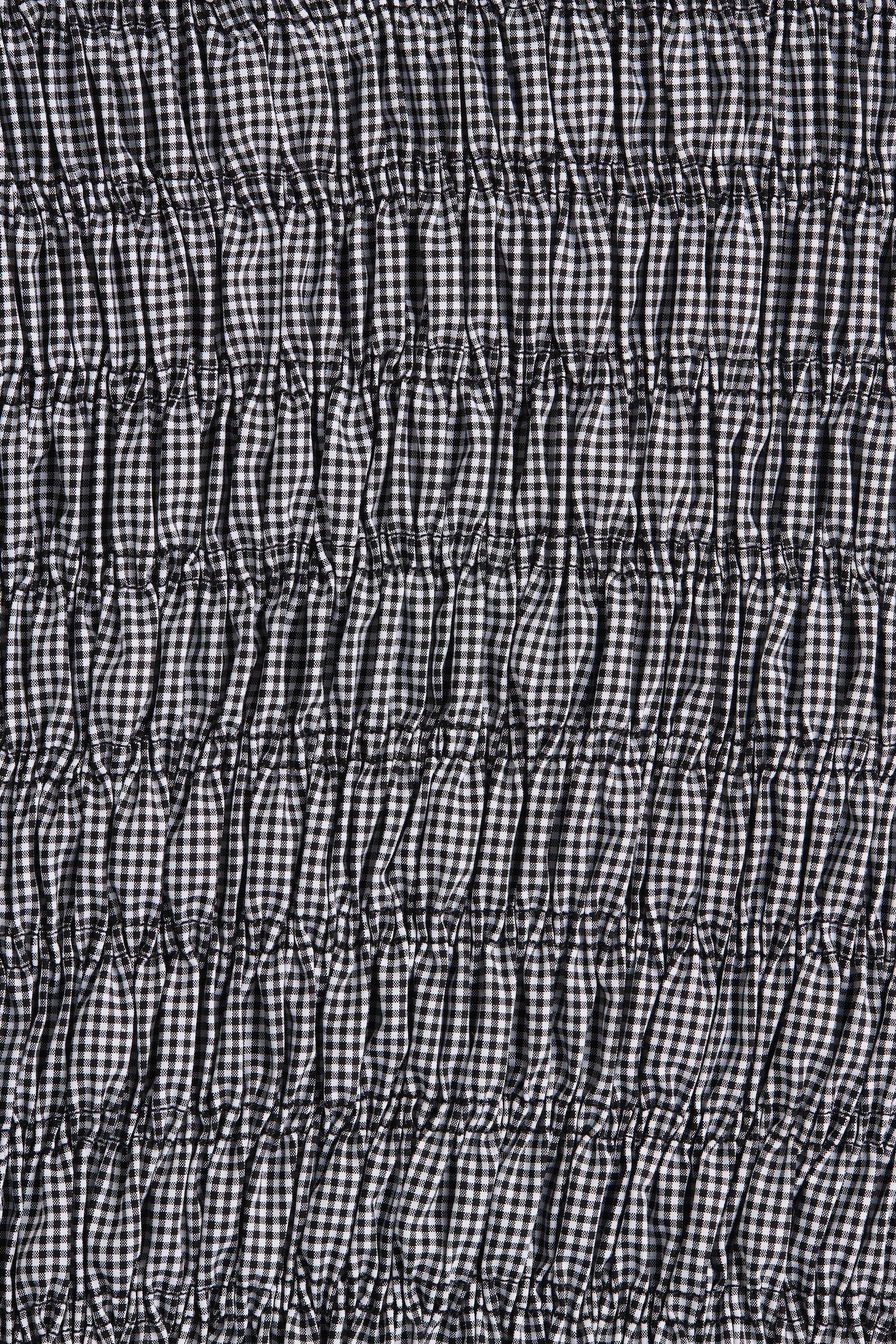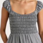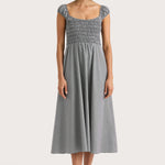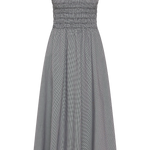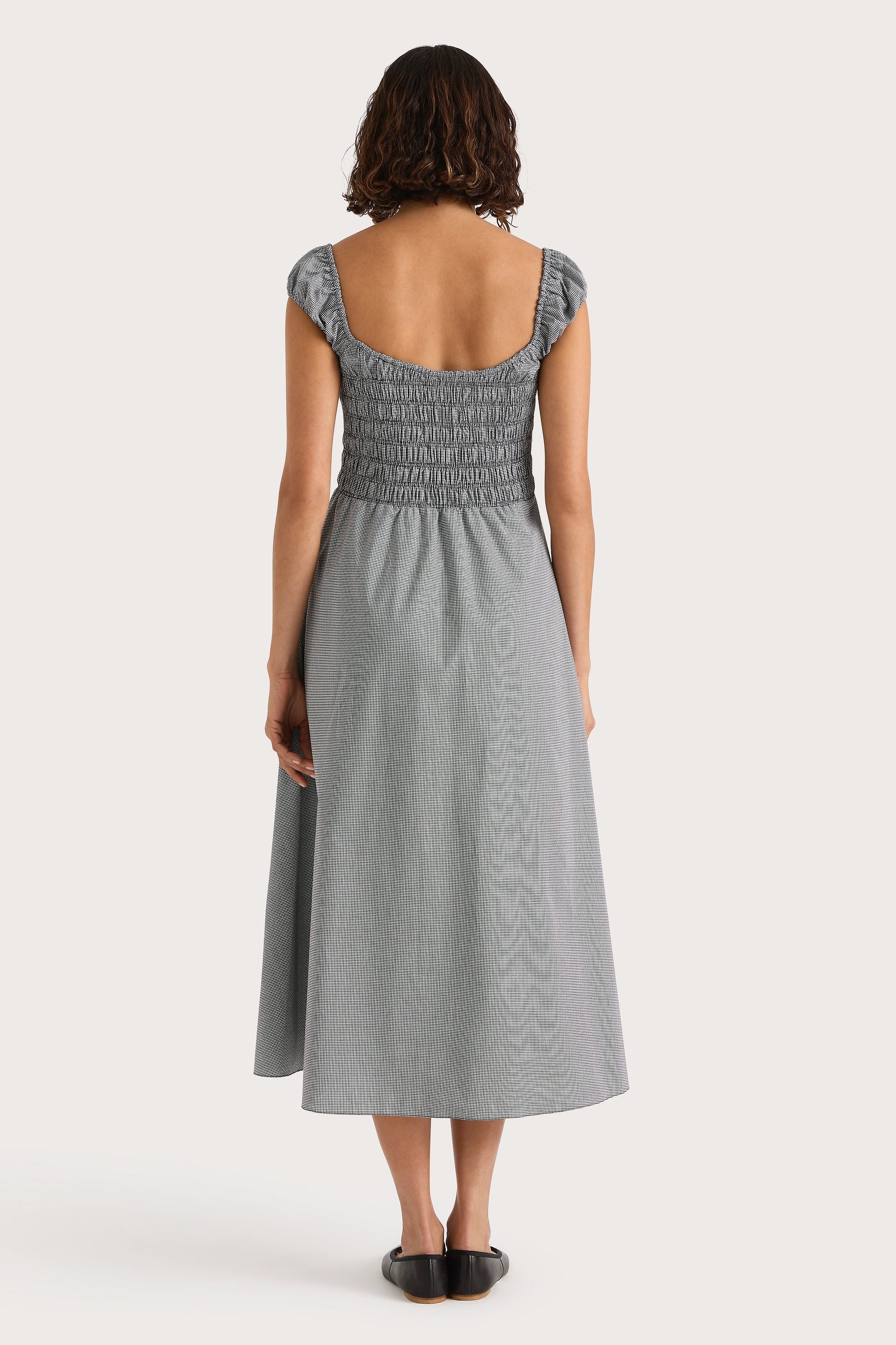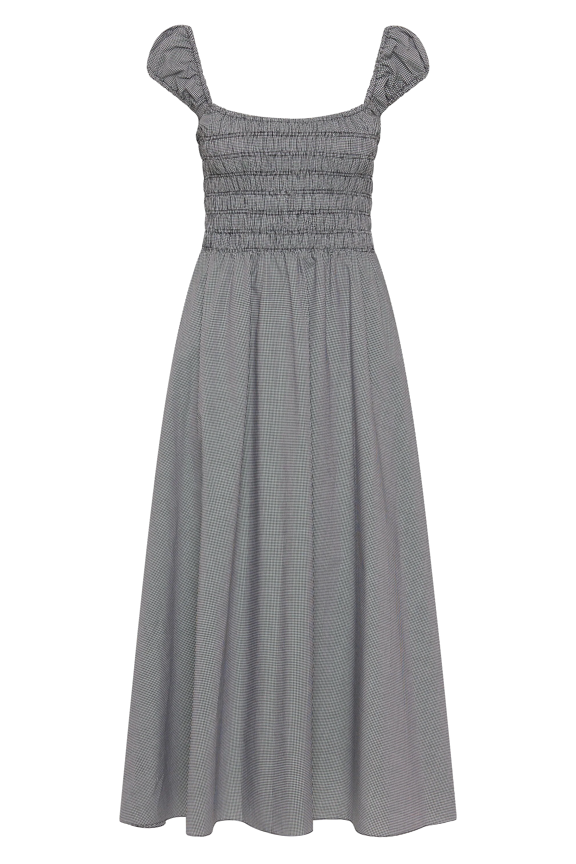 A beloved and signature silhouette for FAITHFULL with a romantic shape and undertone. It features a scooped neckline with short cap sleeves, elasticated at the cuff. It is shirred through the bodice, gathering around the waist, before falling into a soft A-line skirt, cropping below the knees. Designed from a unique 100% cotton in a yarn-dyed nostalgic black gingham print, wear with a ballet flat for easy everyday dressing.