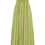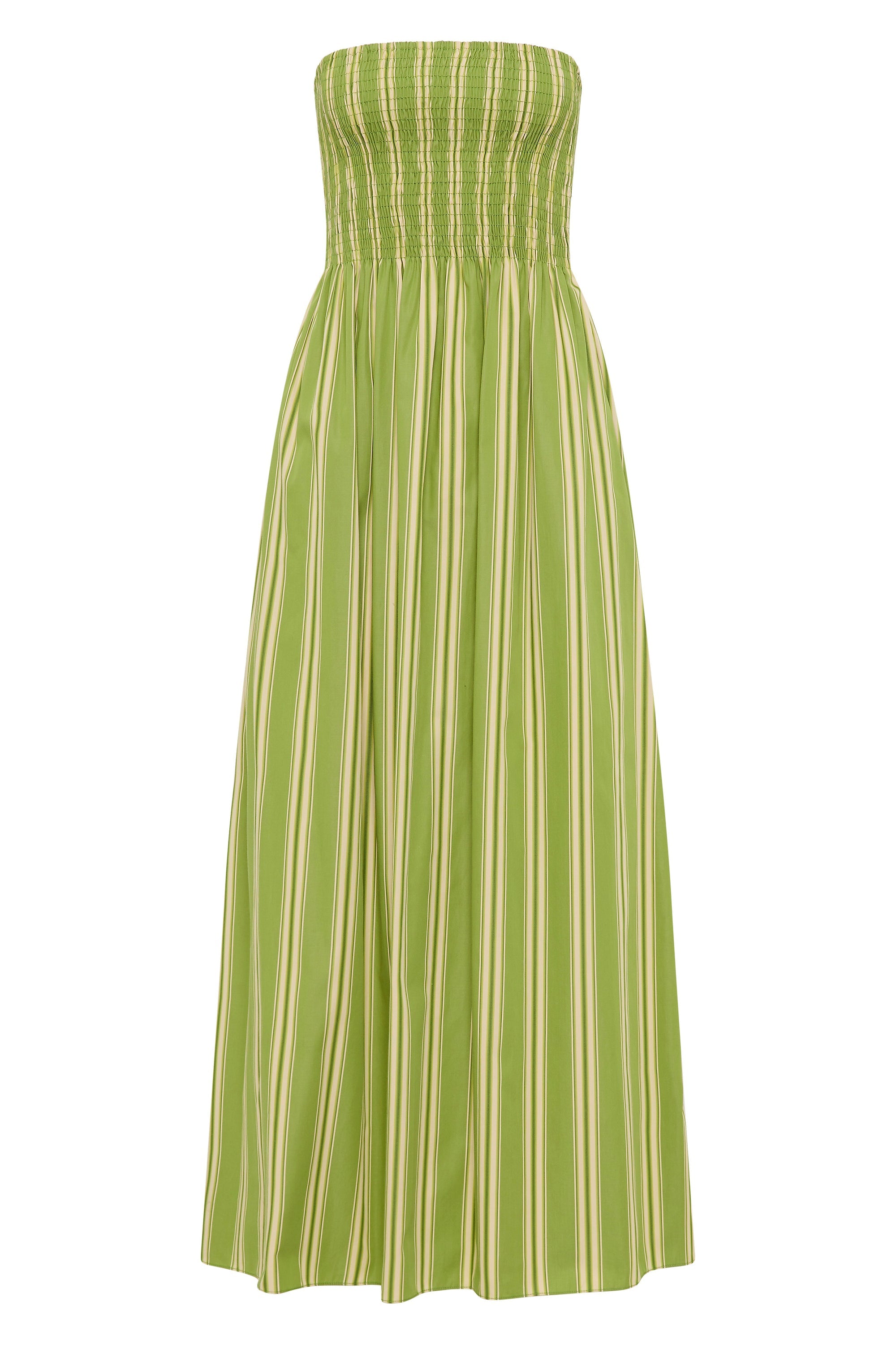 A vacation-inspired midi dress, designed from a signature 100% BCI Certified organic cotton yarn-dyed in a vibrant green stripe. Strapless and shirred through the bodice, it features a gathered waist that falls into a soft A-line skirt, cropping above the ankles. Style with a simple sandal for effortless beach to bar dressing.