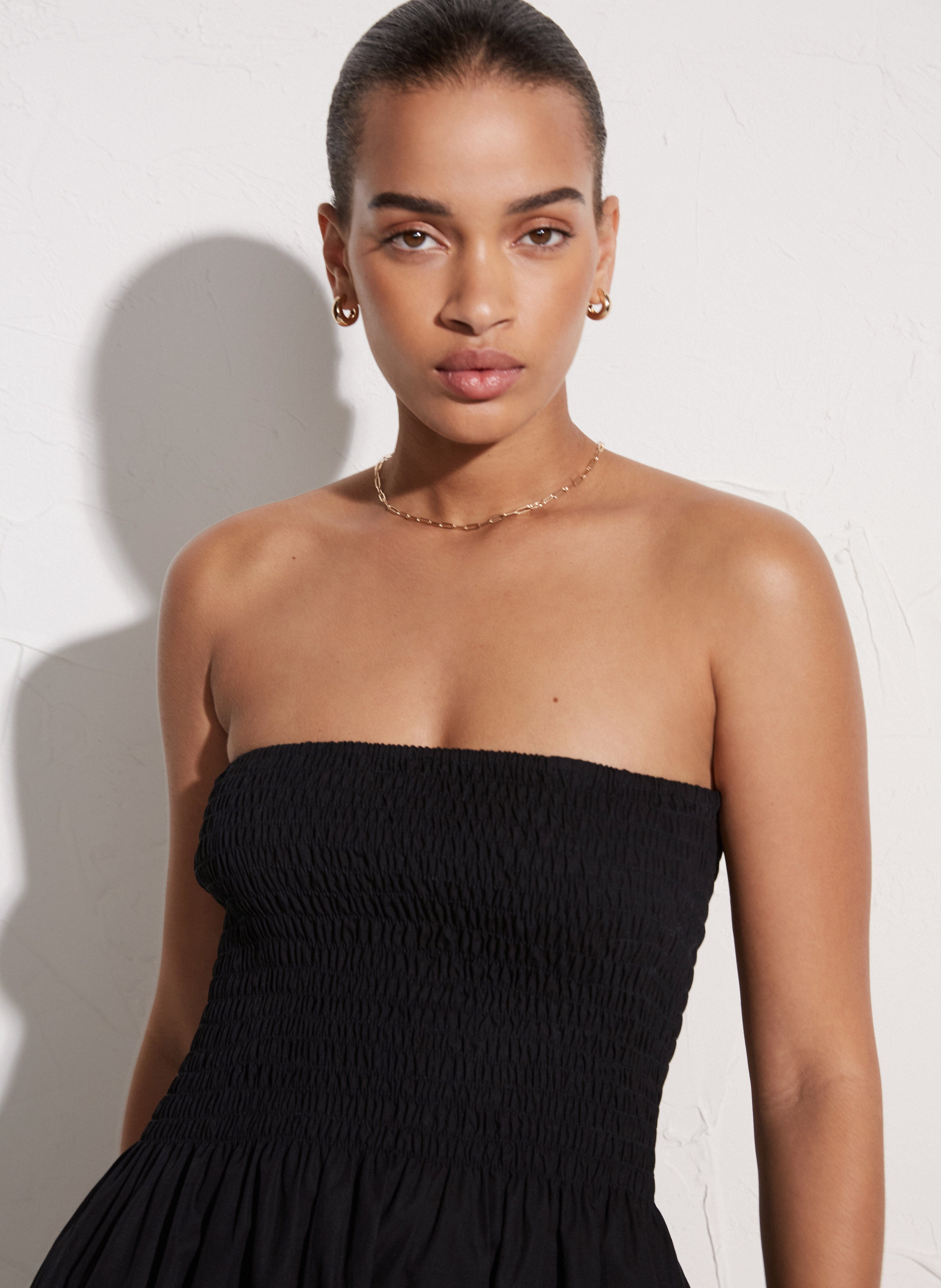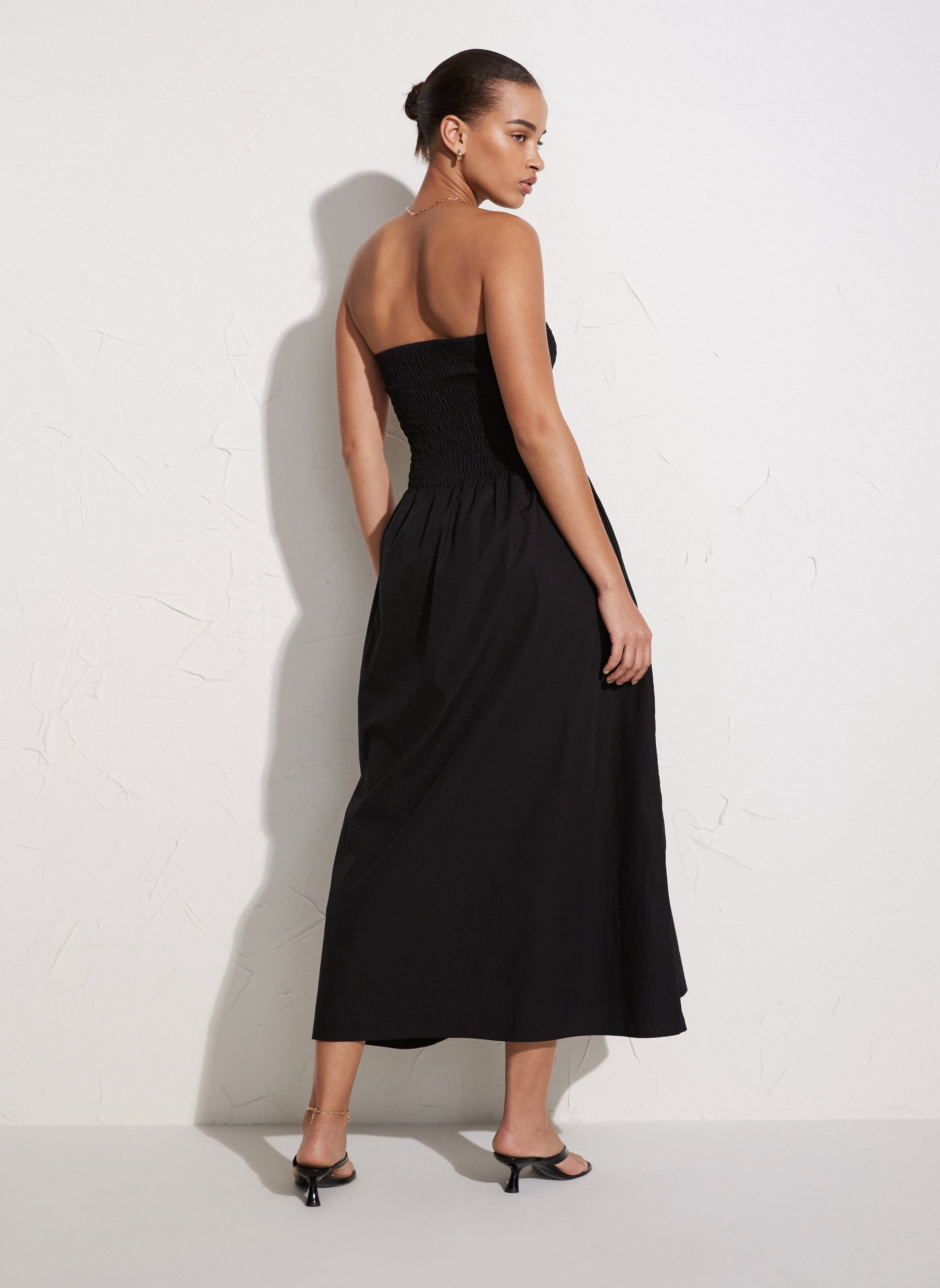 An exciting silhouette of our El Sol collection is the beautiful Madella Midi in Plain Black. Easy wearing by design, this strapless style has been cut from a lightweight, crisp Cotton Poplin - OEKO-TEX100® Certified and features our signature shirred bodice for comfort. Detailed with pockets and offering a gathered midi length skirt, the Madella Midi is every bit as fun as it is functional.