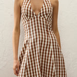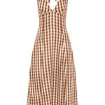 A 1960s-inspired midi dress, designed from a signature 100% European Flax® linen in a nostalgic gingham print. Fitted through the bodice with a V-neckline and halter neck ties, it is shirred through the back waist before falling into a soft A-line skirt that crops below the knees. Style with a simple heel for effortless day to night dressing.