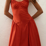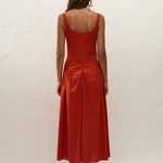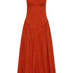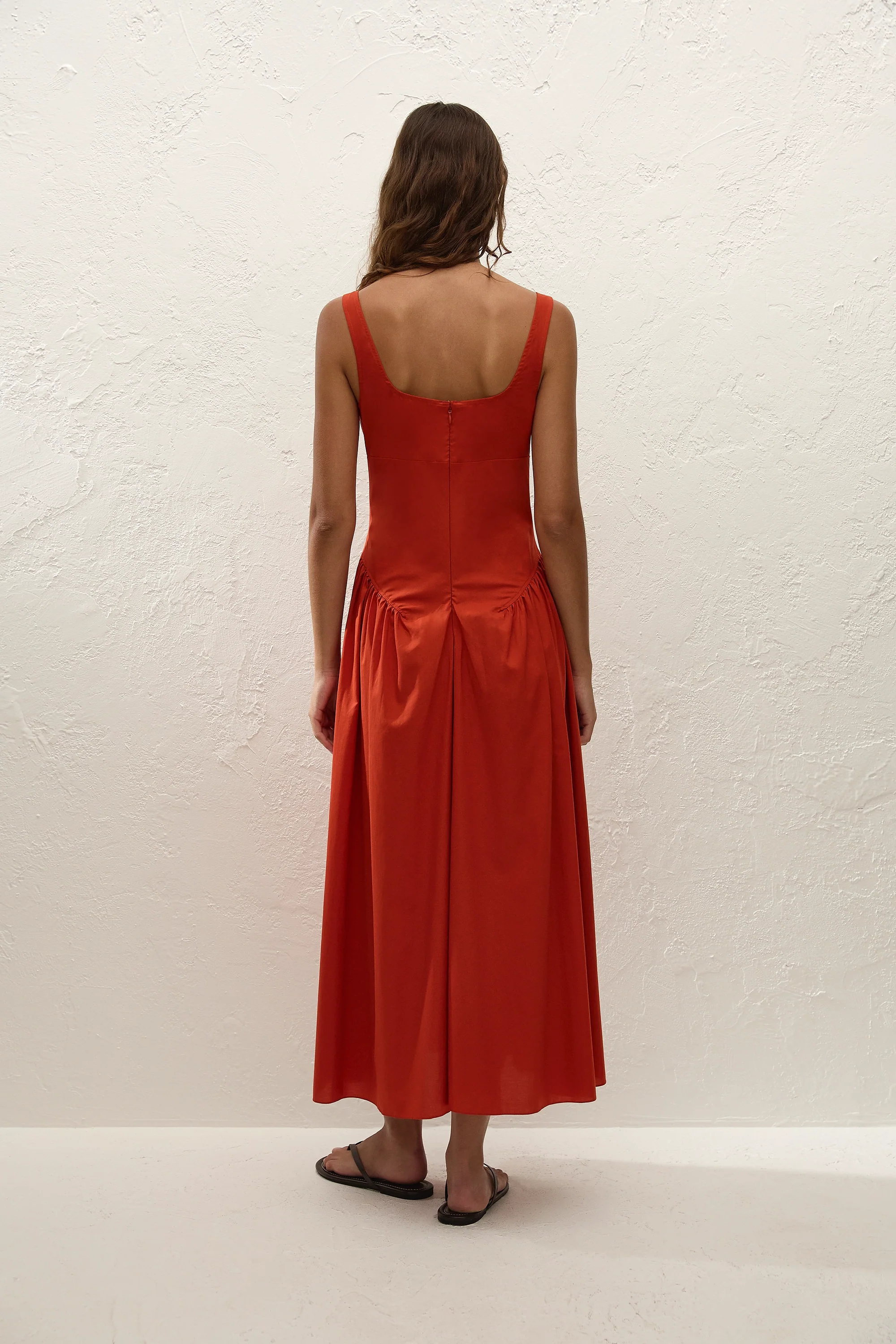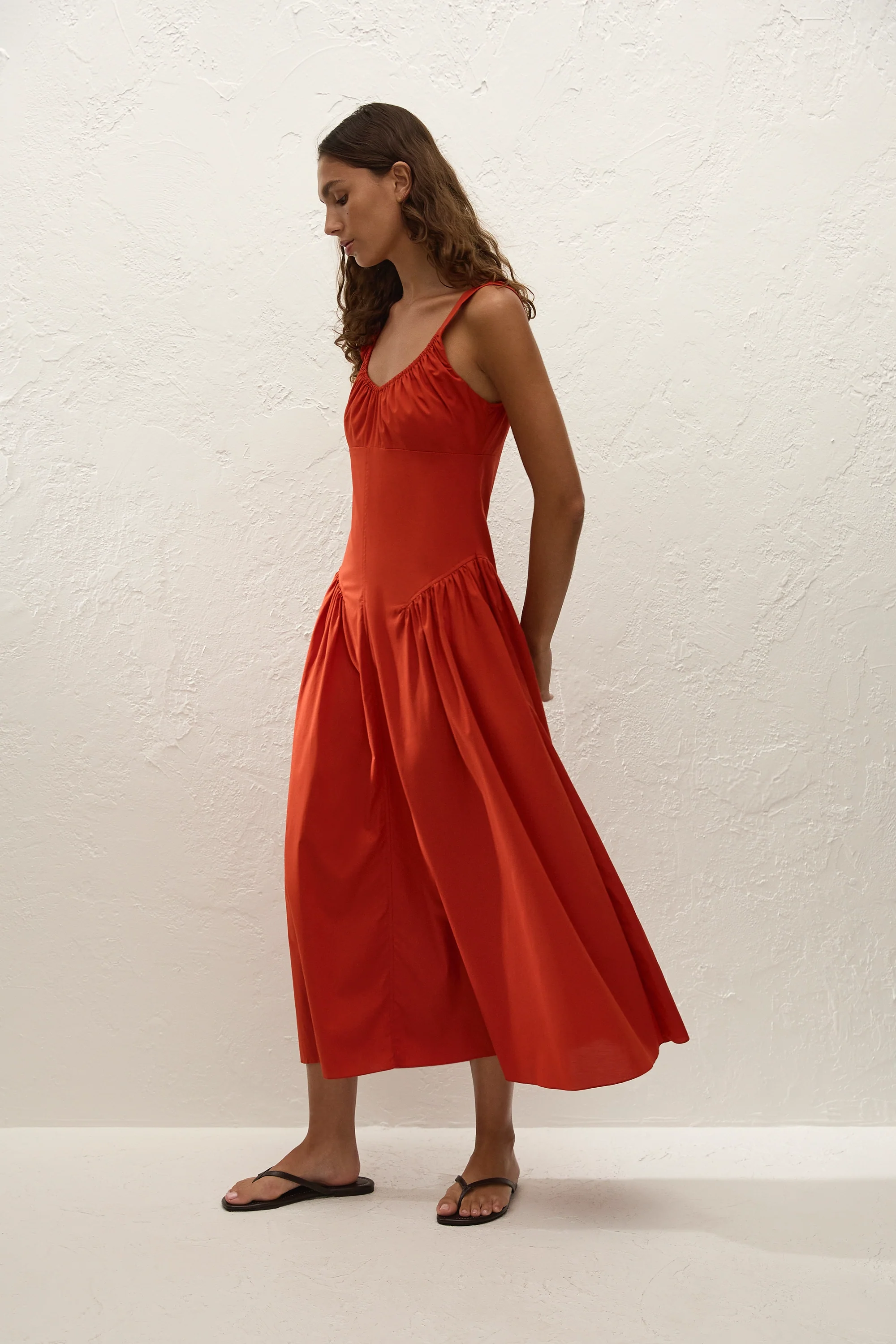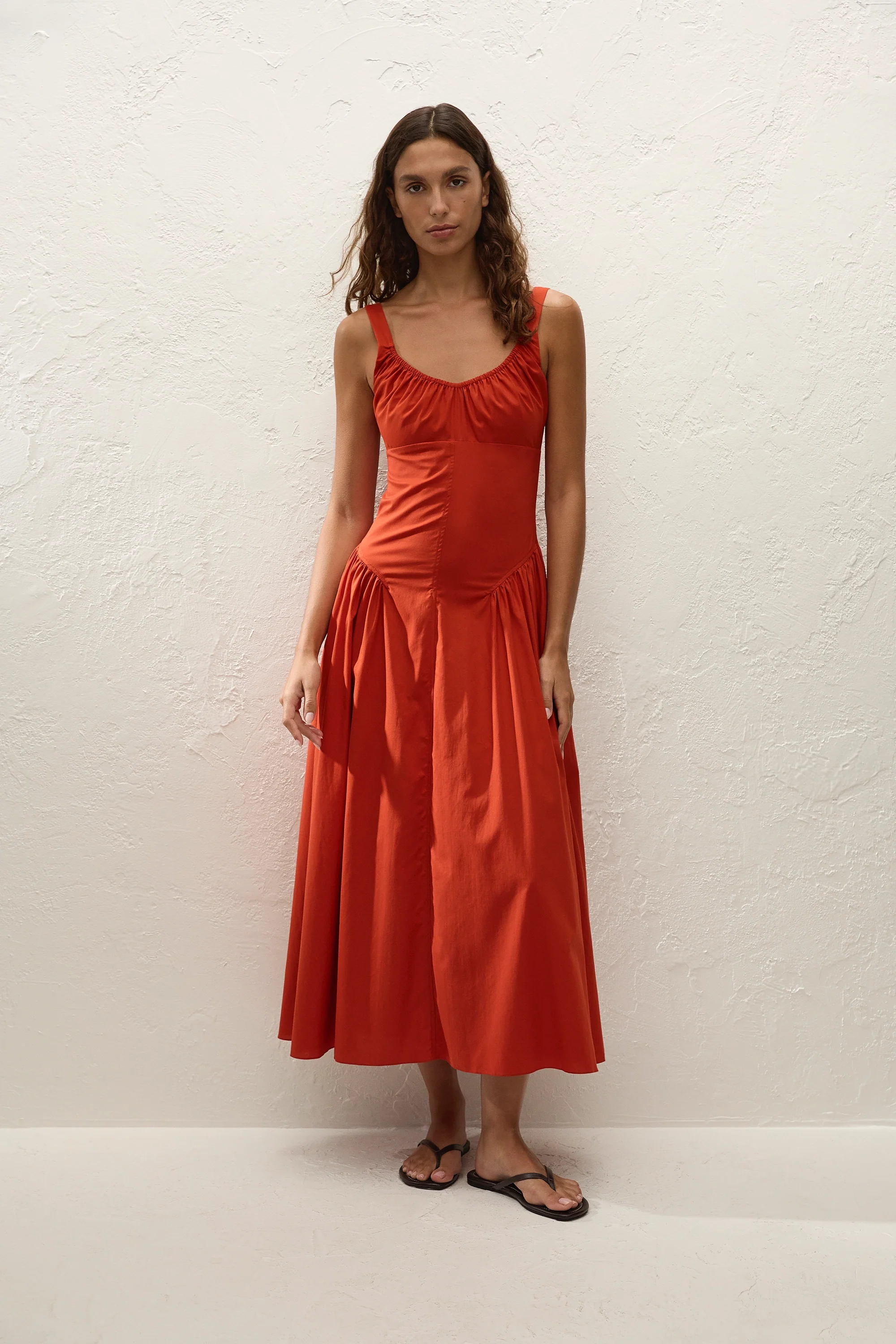 A seasonal midi dress, designed from a signature 100% BCI Certified organic cotton in a yarn-dyed dusty tomato red. Fitted through the bodice with a scoop neckline and a gathered bust, it features a drop waist silhouette with further gathering at the sides. From there it falls into a soft A-line skirt, cropping above the ankles. With effortless throw-on throw-off appeal, style with a simple sandal for day to night dressing.