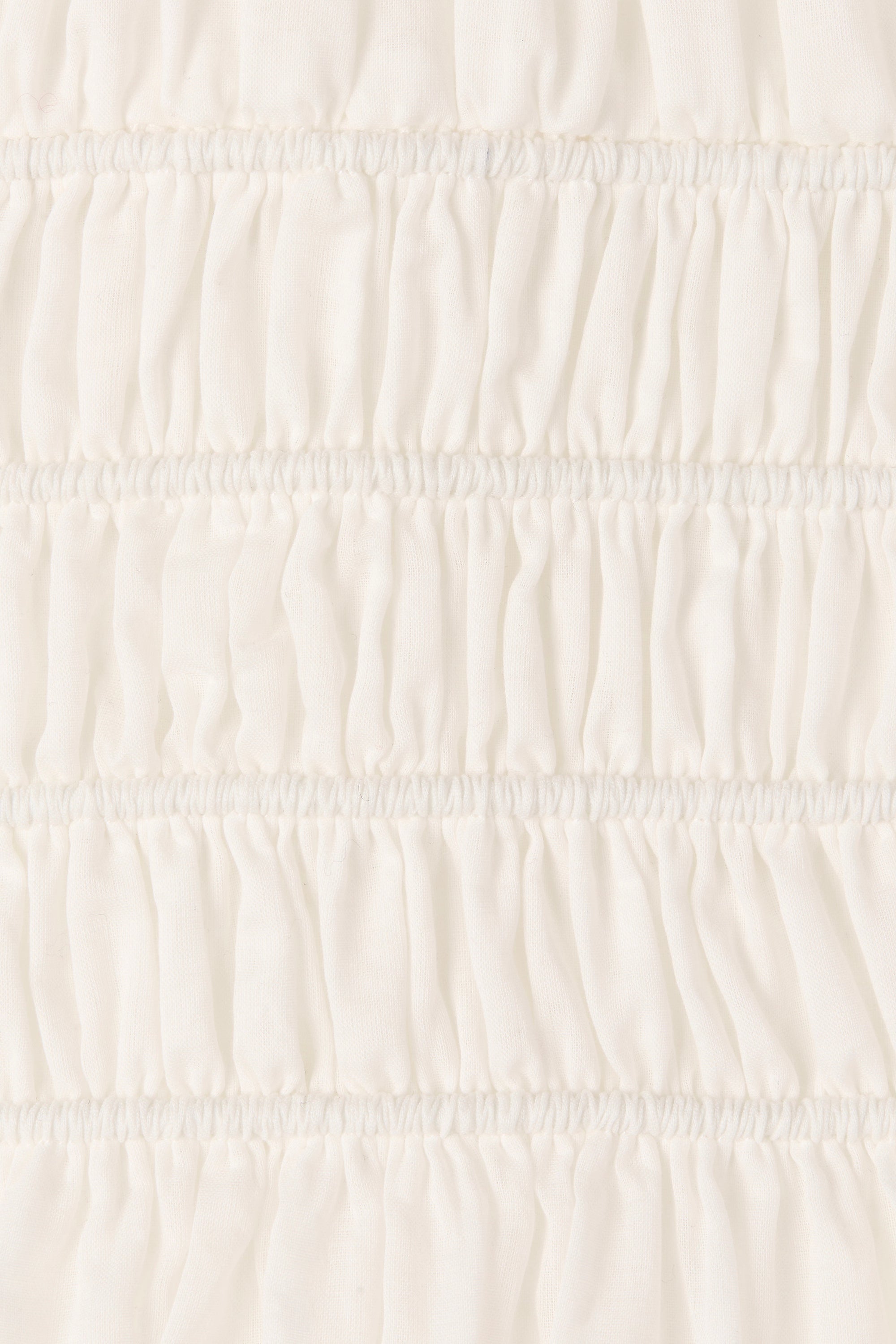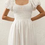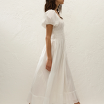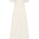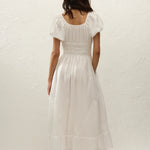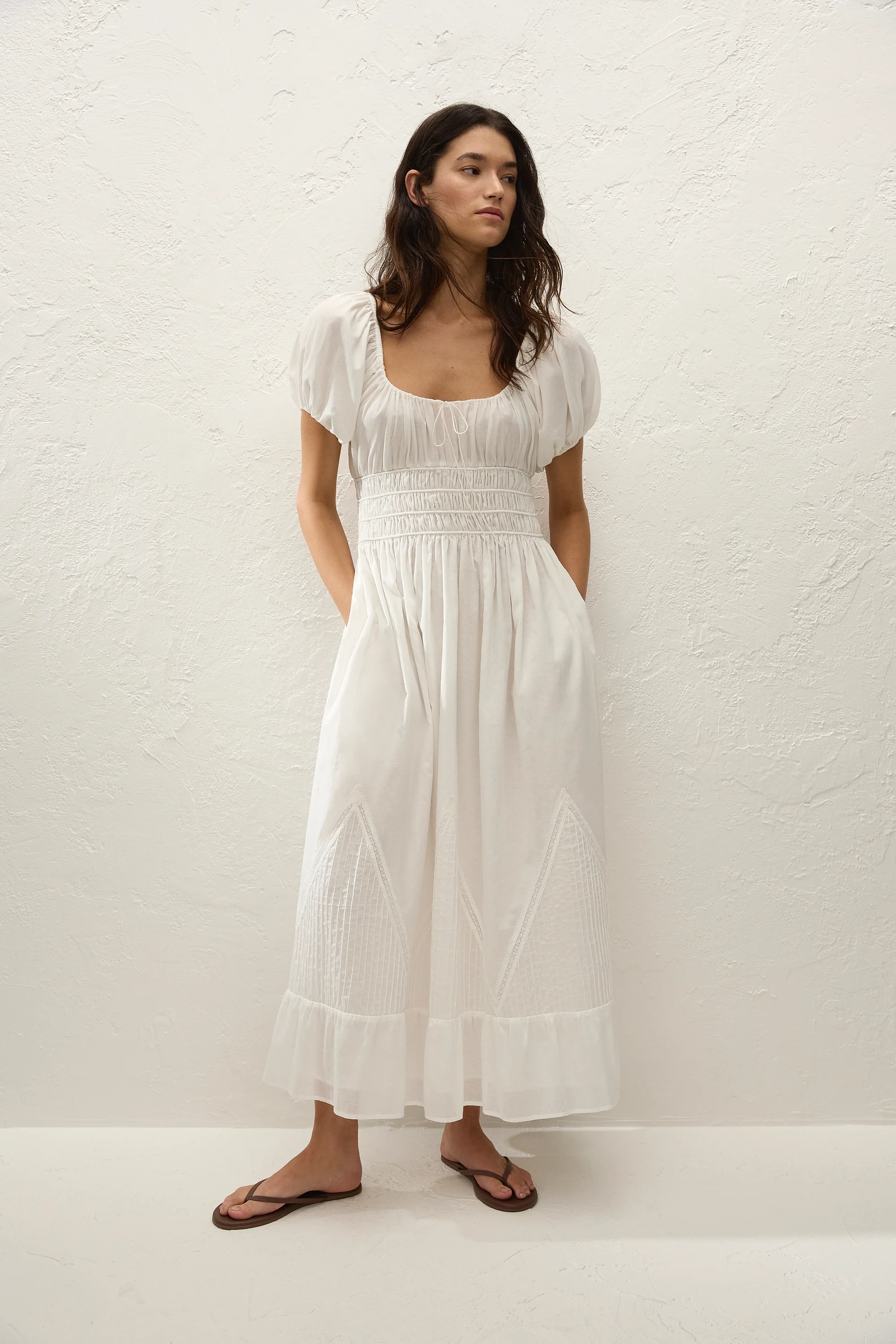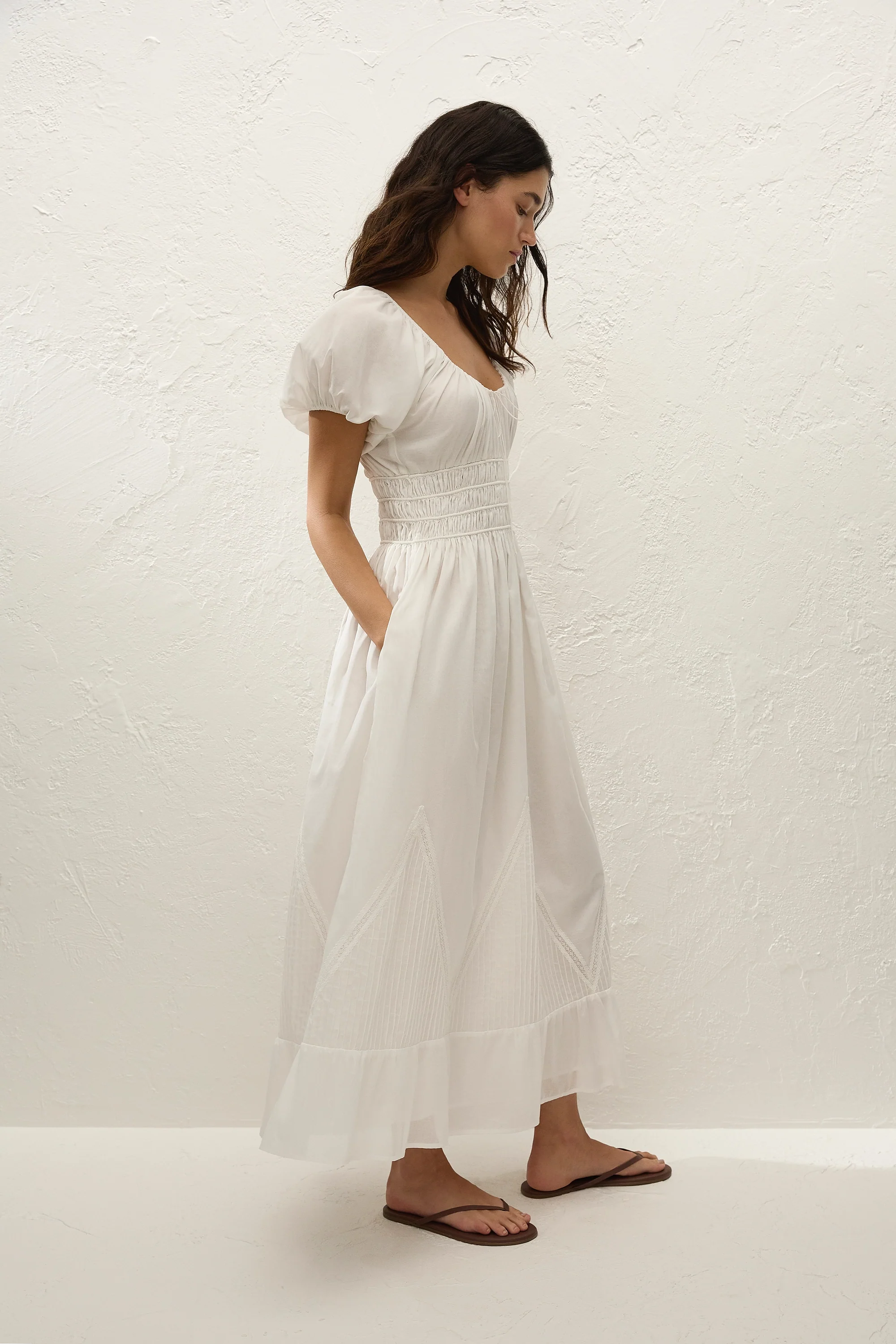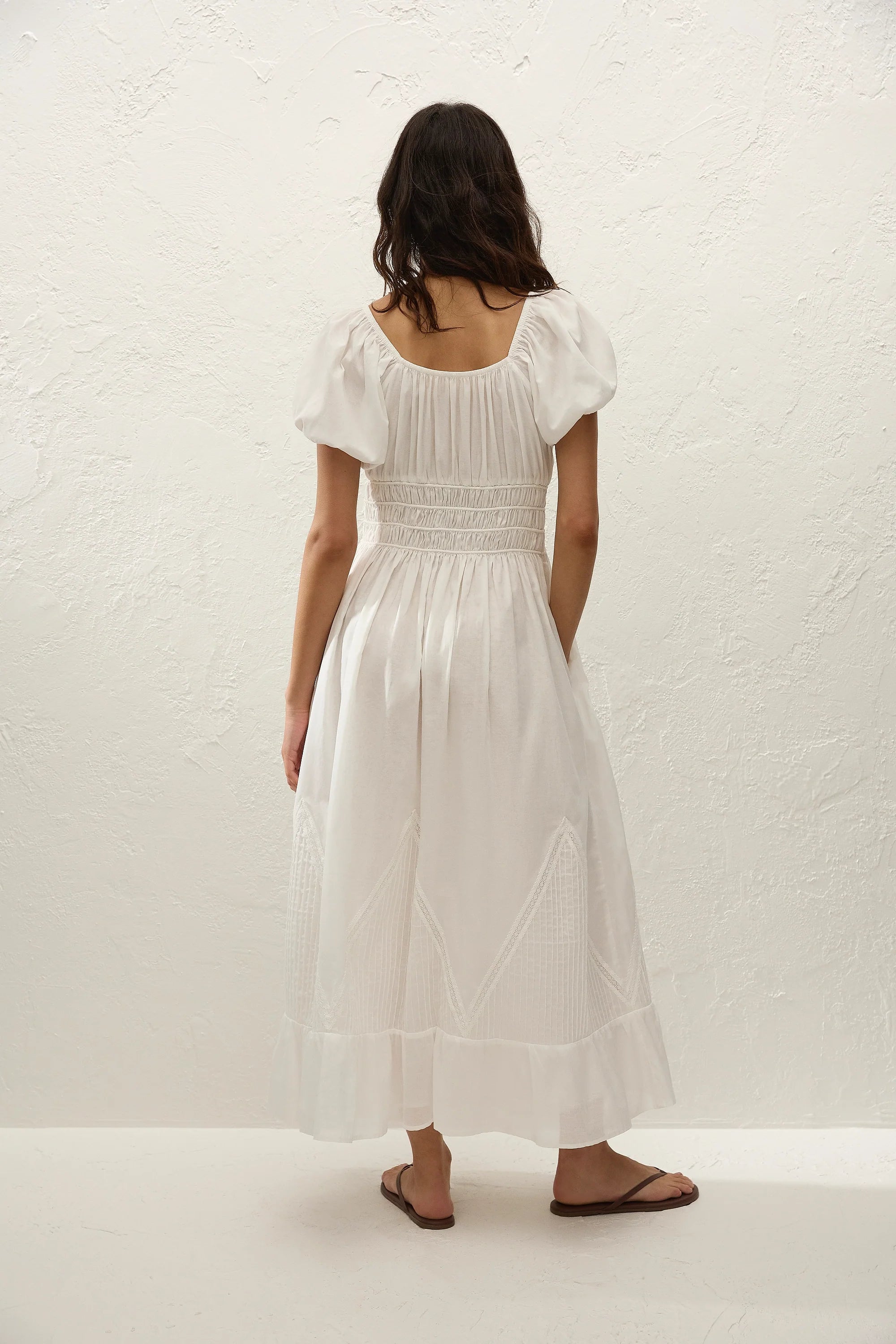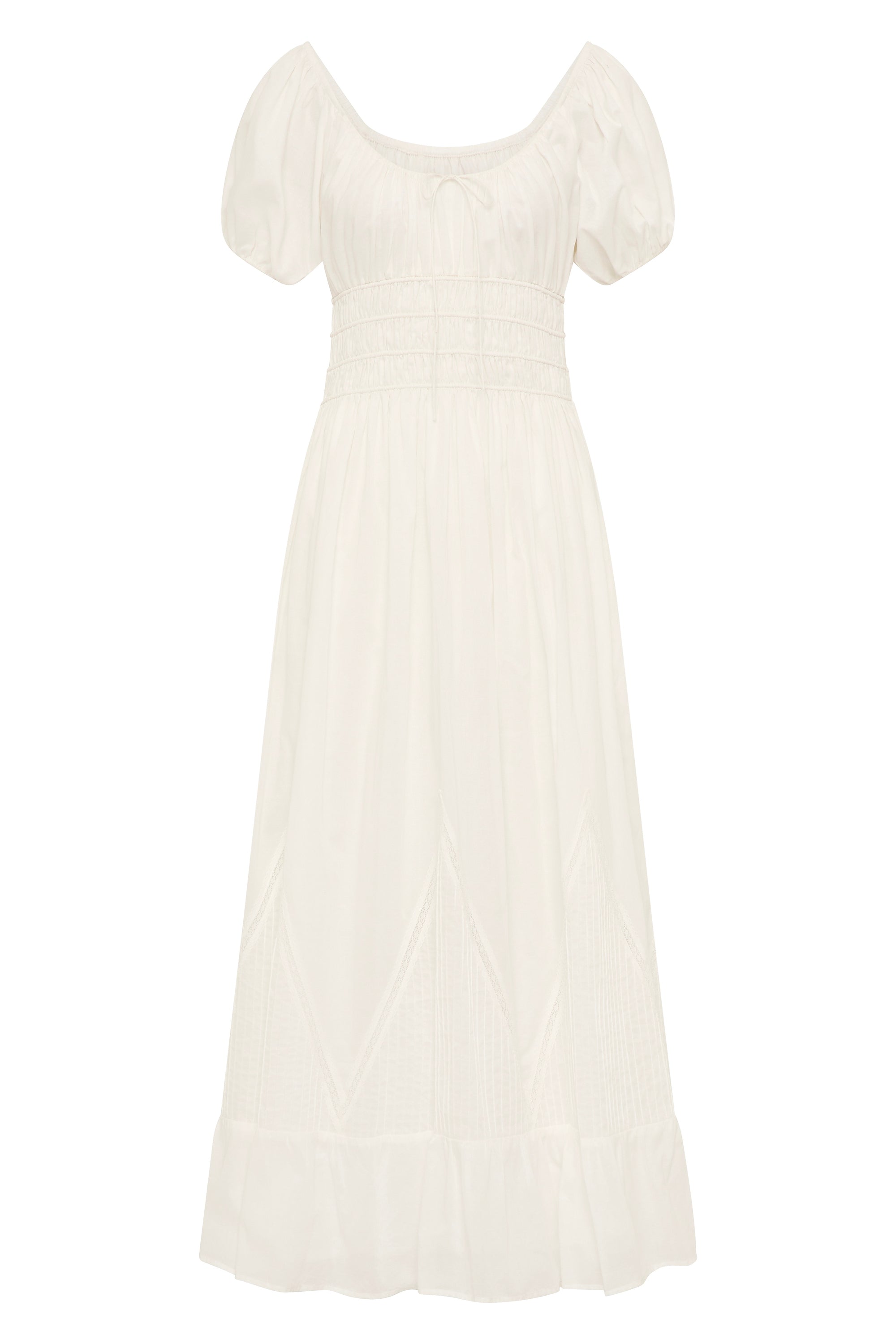 A vintage-inspired midi dress, designed from a signature 100% BCI Certified organic cotton in a warm white with delicate lace detailing. Gathered through the bust with round puff sleeves, elasticated at the cuff, it cinches in at the waist with a channelled elastic waistband. From there it falls into a soft A-line skirt with a wide frill detail along the hem. Style with a simple sandal for lightweight summer dressing.