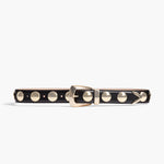 Crafted in Italy of lustrous calfskin, this belt is accented with gleaming, jewelry-like hardware: disc-shaped studs paired with a buckle, loop, and tip.