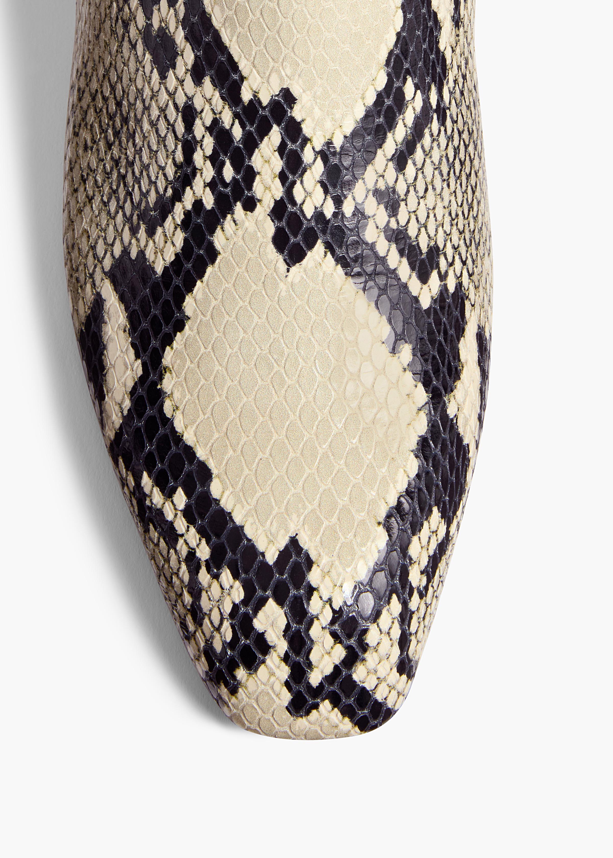 A relaxed interpretation of the classic paddock boot, refined by Italian craftsmanship and python-embossed calfskin. Snip-toe silhouette with the hint of a stacked heel for comfort. Zipper at inside, with gold-toned hardware.