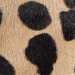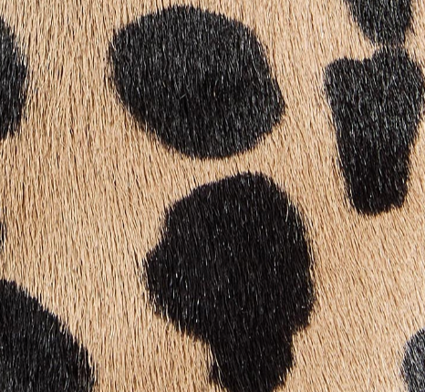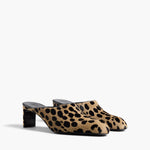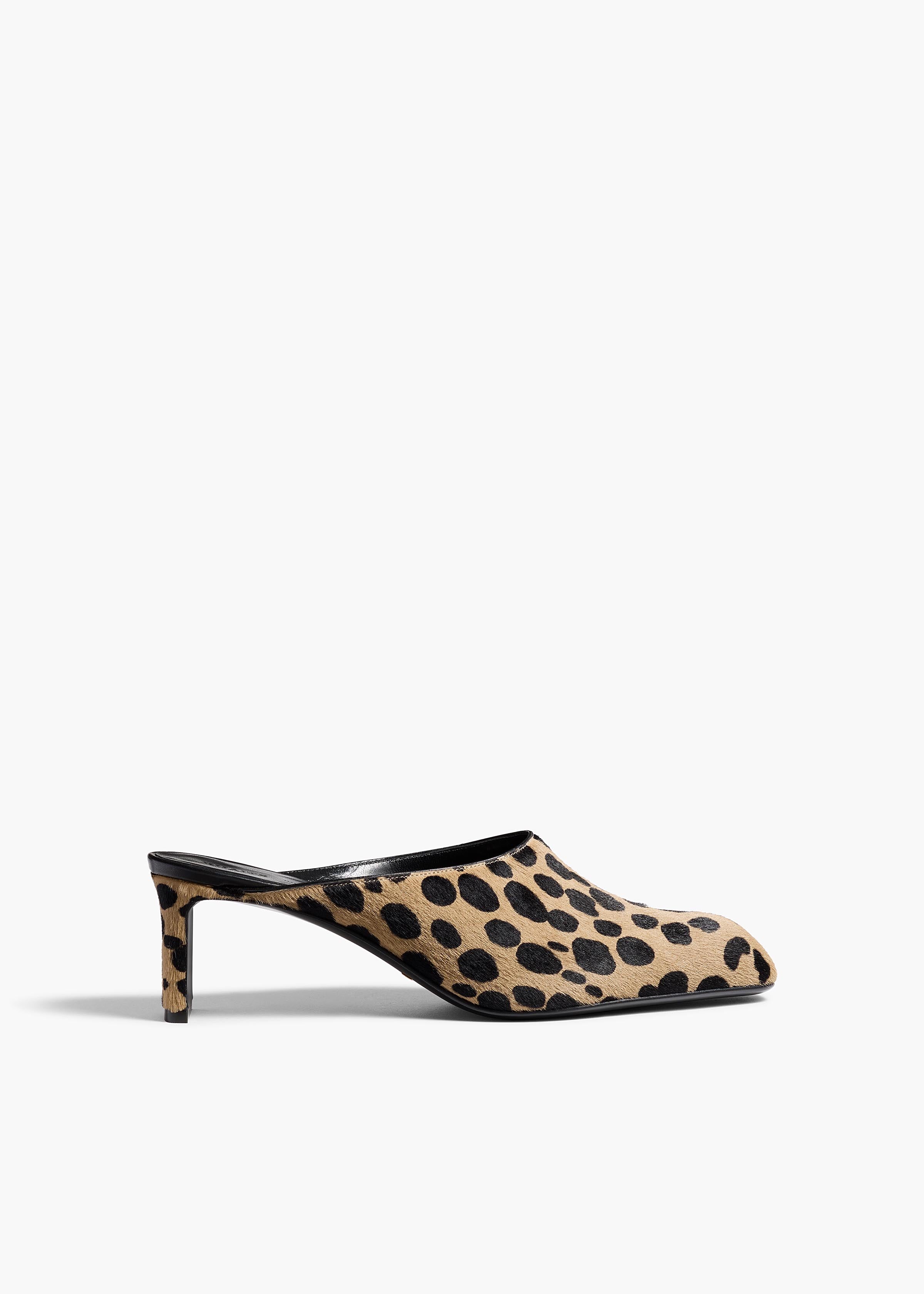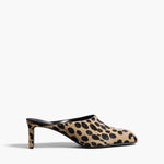 A bold backless heel in playfully spotted hair-on calfskin. Designed for a slipper effect in a snip-toe silhouette borrowed from boot. Signature gold staple details at leather sole to catch the light with every step. Interior lined in velvety suede.