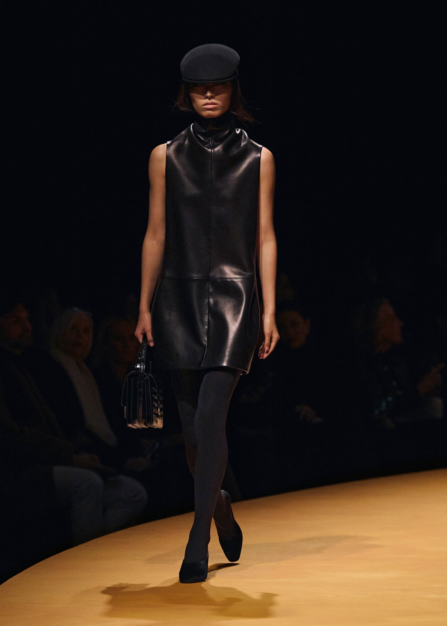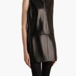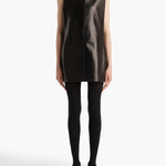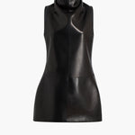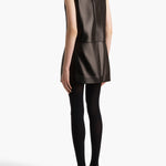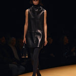 A bell-shaped minidress distinguished by draped, scarf-inspired stand collar with horizontal seaming at back. In buttery French lambskin selected for its exceptional lightness. Button and concealed zipper at center back.