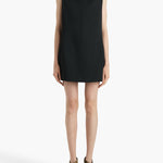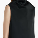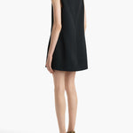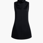 A bell-shaped minidress distinguished by draped, scarf-inspired stand collar with horizontal seaming at back. Tailored in bonded crepe satin selected for its dense, sculptural quality. Button and concealed zipper at center back.